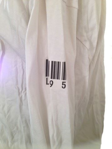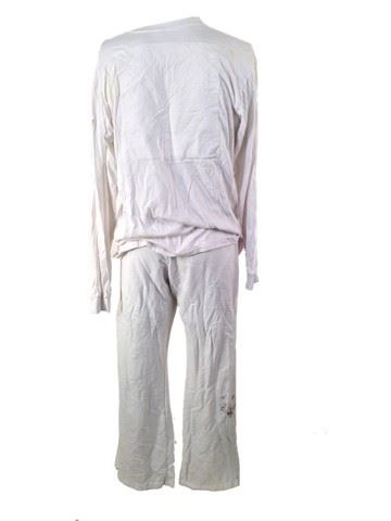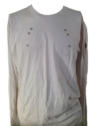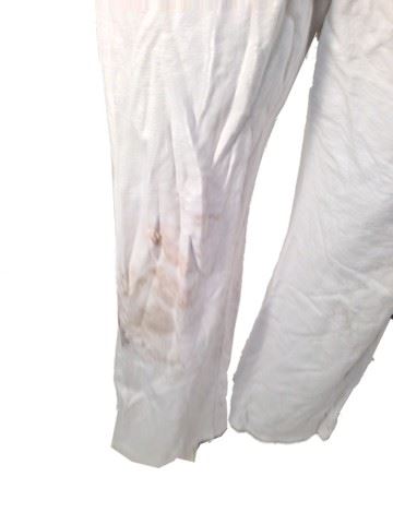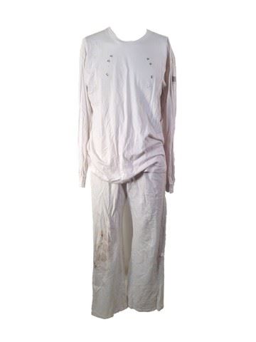 Screen worn, survivor outfit,(XL) cotton"J Crew" white pants and cotton shirt, each shirt has a barcode on the left shoulder with 3 numbers, numbers vary between each survivor, oufits are production soiled with dirt and blood stains. Used in Resident Evil: Afterlife, Retribution and The Final Chapter.