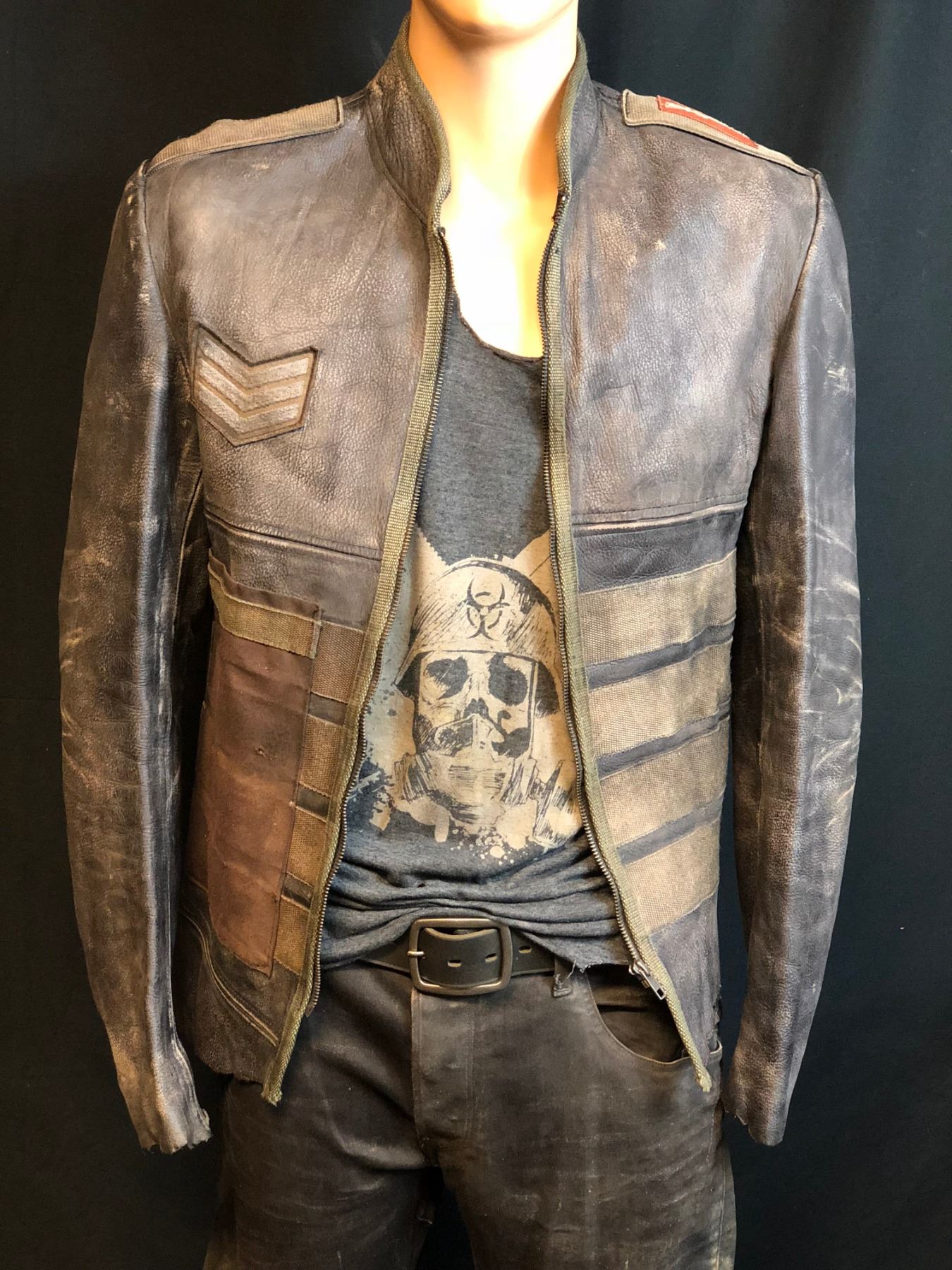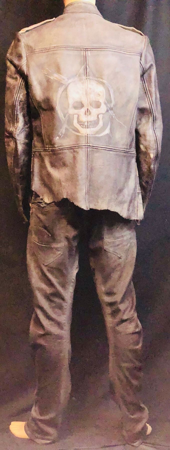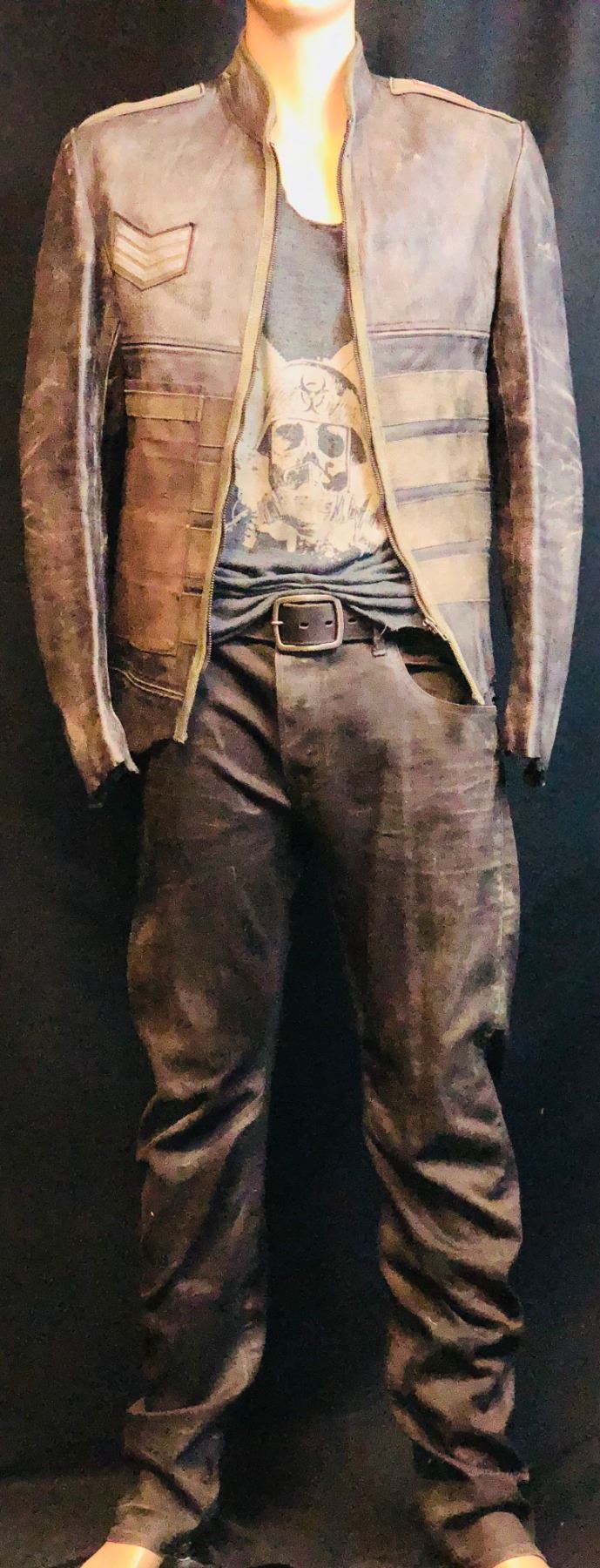 The costume consists of a "level 1" screen worn, hero, distressed from production, dark grey tank top with zombie gas mask skull print(L), leather jacket with skull print on back; a pair of black denim 'Raw G-Star' jeans (3D SLIM) with production soiled knee pads (one pad has skull print), and(M) black leather silver belt. Wardrobe tags included.