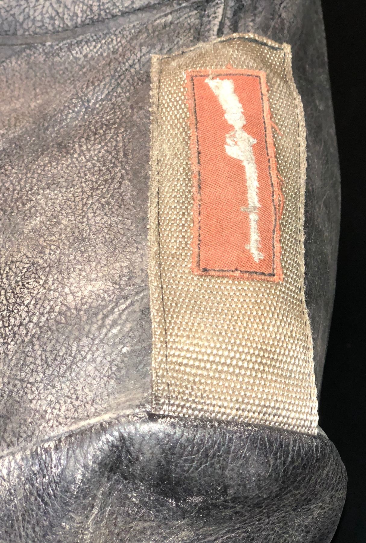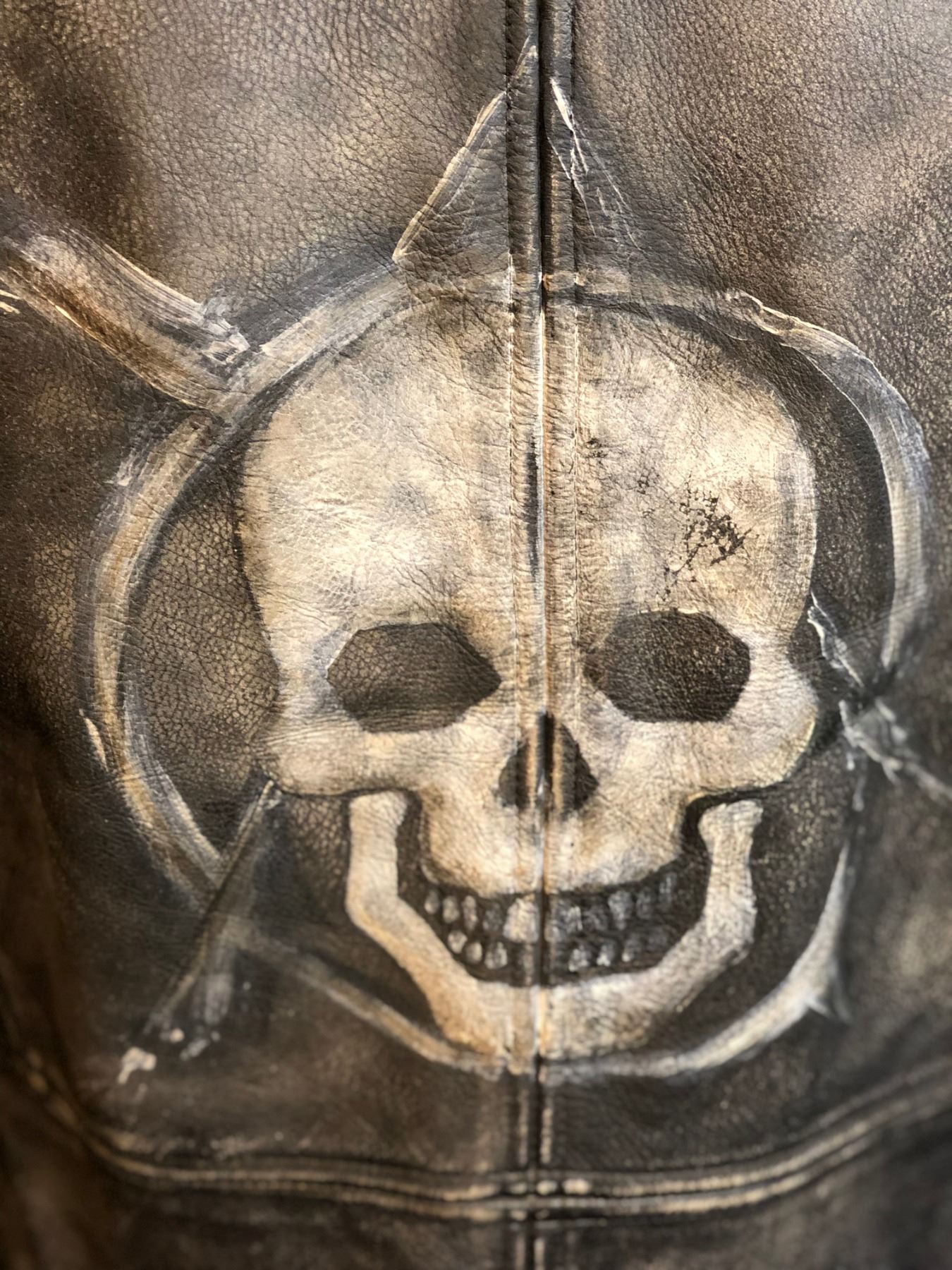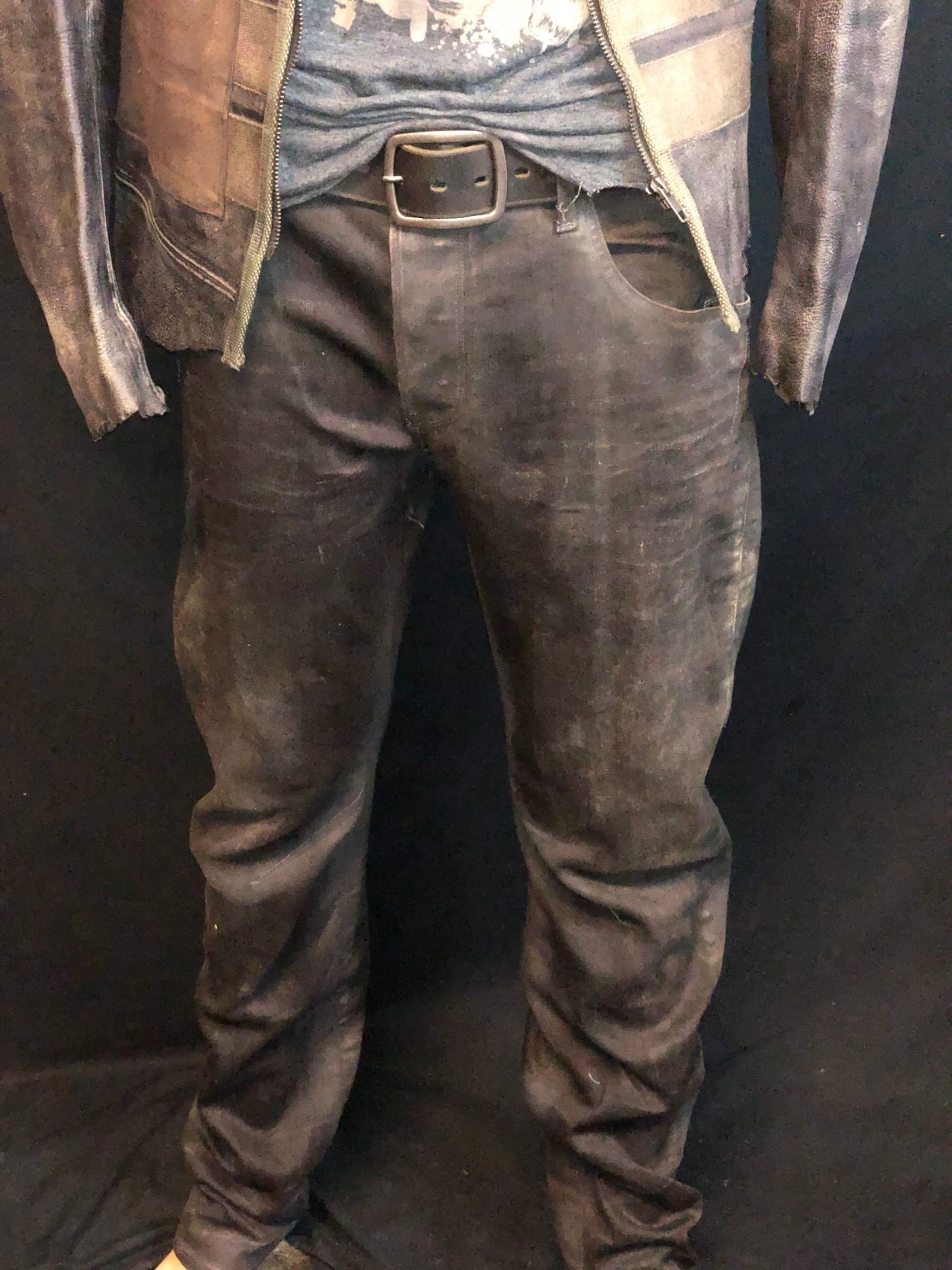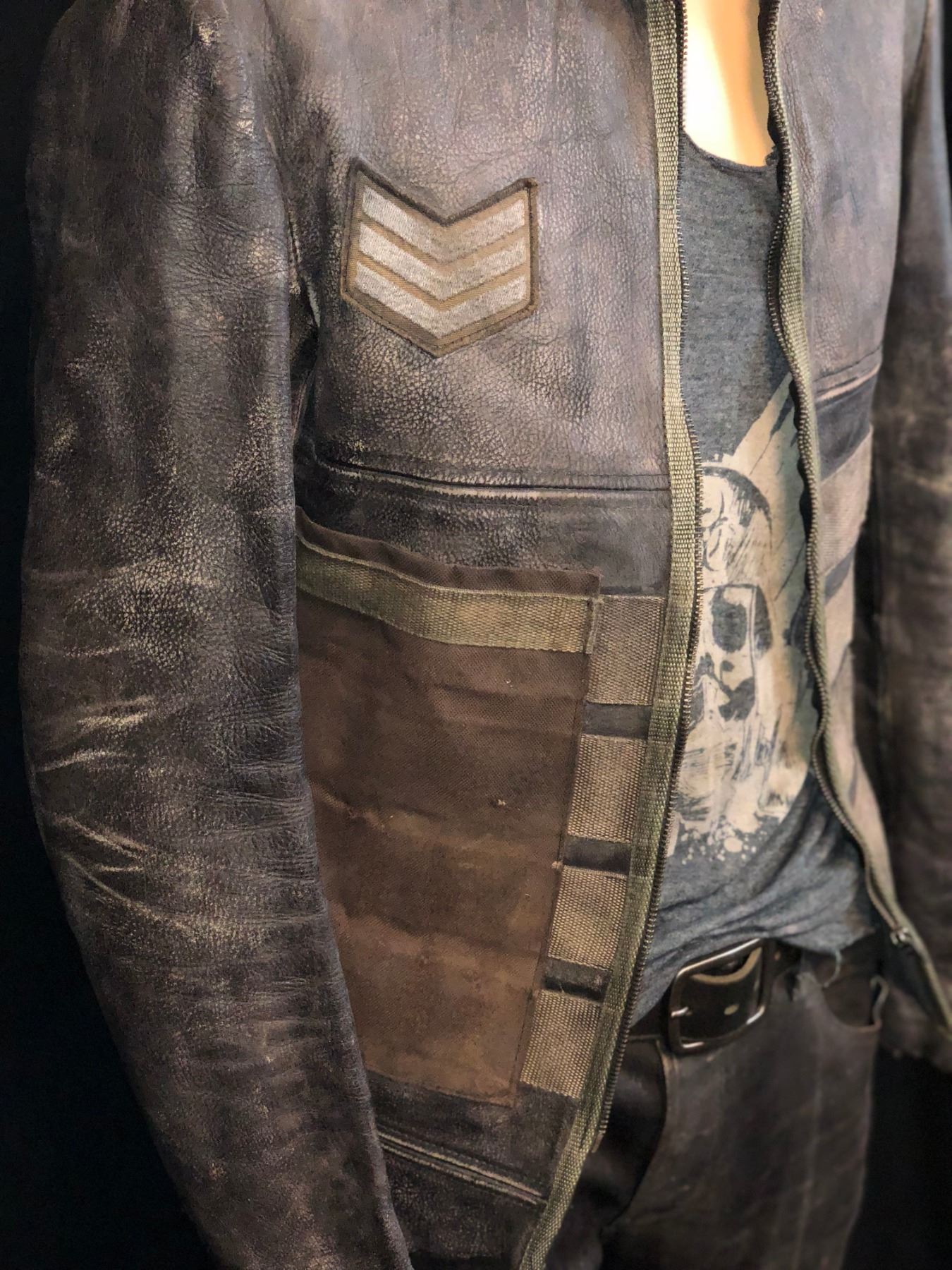 The costume consists of a "level 1" screen worn, hero, distressed from production, dark grey tank top with zombie gas mask skull print(L), leather jacket with skull print on back; a pair of black denim 'Raw G-Star' jeans (3D SLIM) with production soiled knee pads (one pad has skull print), and(M) black leather silver belt. Wardrobe tags included.