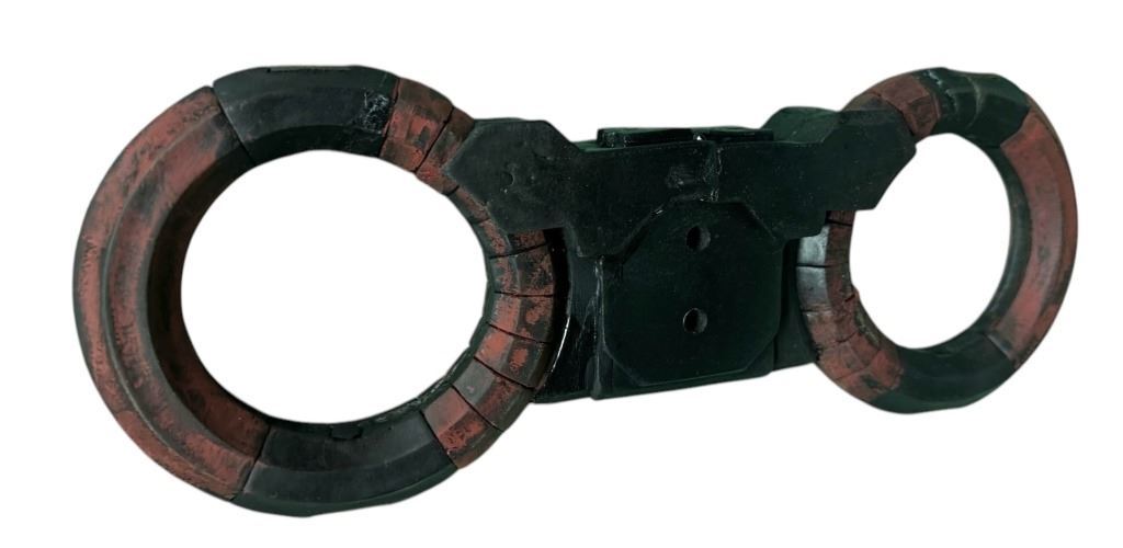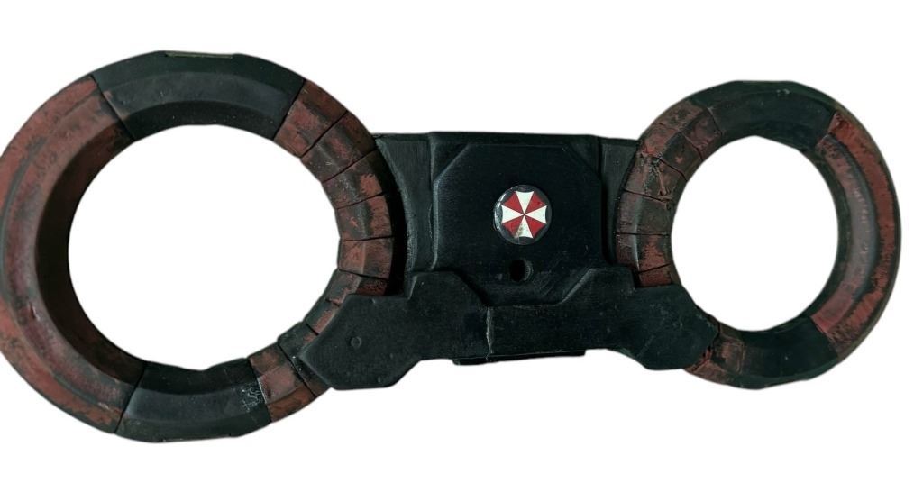 Original Umbrella Corporation handcuffs used in the production of the Paul W. S. Anderson directed science fiction action film 'Resident Evil: The Final Chapter' (2016), where Alice returns to where the nightmare began: The Hive in Raccoon City, where the Umbrella Corporation is gathering its forces for a final strike against the only remaining survivors of the apocalypse.