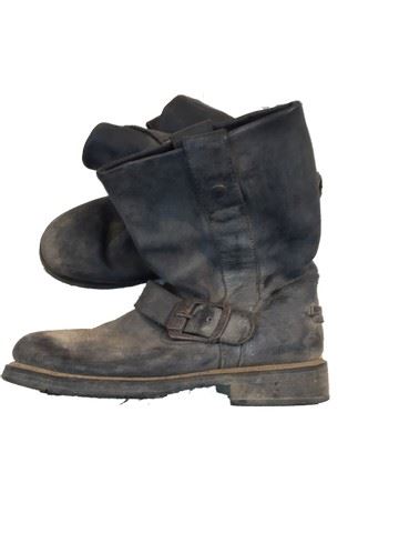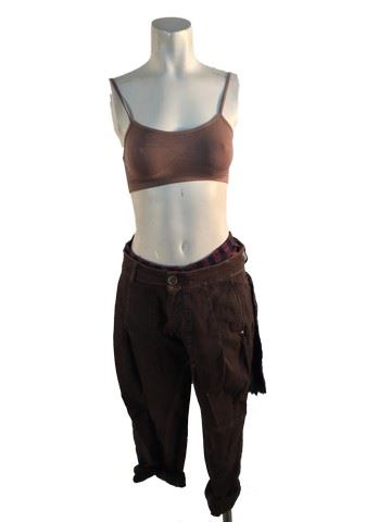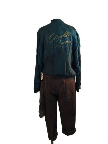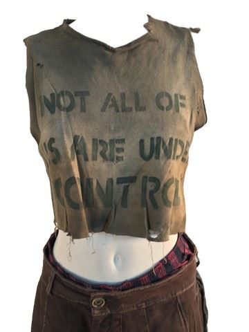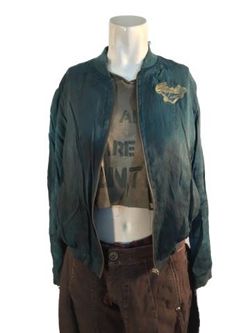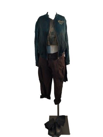 Abigail (Ruby Rose) screen worn, hero, distressed from production, faded teal long sleeve zipper front with Starlite Lanes on the back jacket, grey cut off with Not all of Us Are Under Control on the front top, pink and navy checker boxer shorts, brown denim 'High Use' pants, and worn black "Harley Davidson "boots with buckle on the side. Wardrobe tag included and reads " Level #1".
