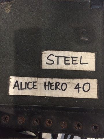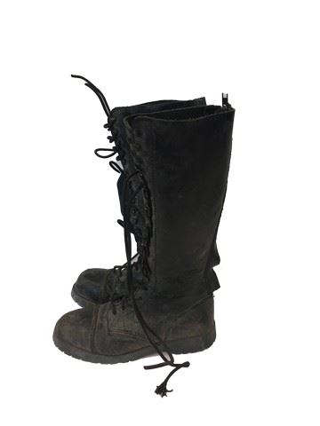 Alice's (Milla Jovovich) screen worn hero, black laceup knee boots, zip up in the back, labeled "Alice Hero 40 Steel". (15x10)