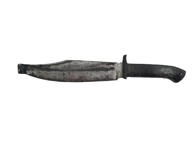 Alice's (Milla Jovovich) screen used, stunt, distressed and bloody, rubber knife (black hilt, severed tip) with inscription, "For the wages of sin is death; Romans 6:23". (Approx. 14")