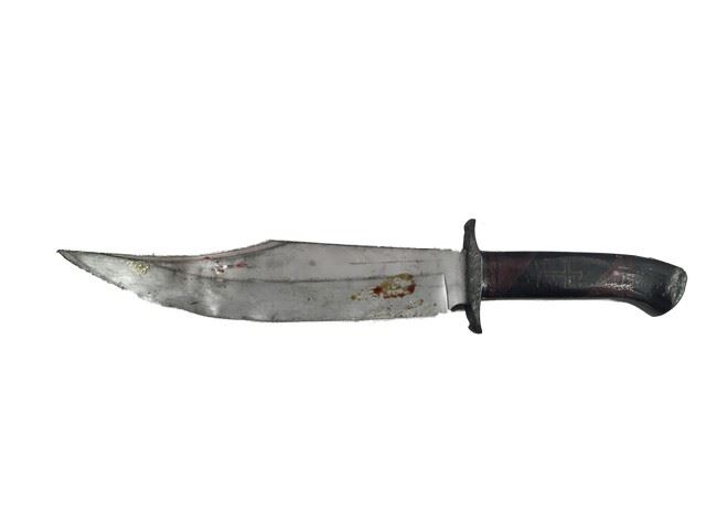 Alice's (Milla Jovovich) screen used, stunt, distressed and bloody, rubber knife (red cross design on hilt) with inscription, "For the wages of sin is death; Romans 6:23". (Approx. 14")