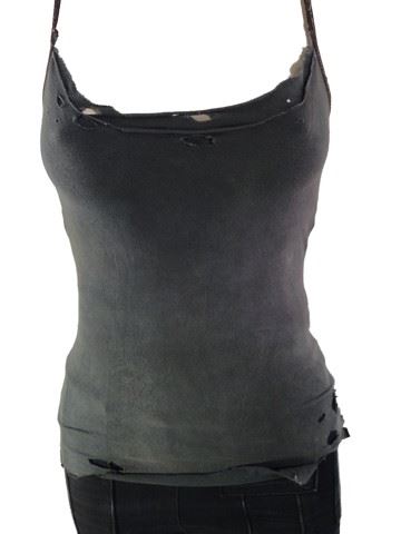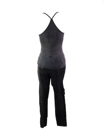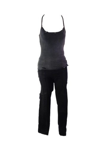 Alice (Milla Jovovich) screen worn, distressed from production faded navy blue tank top, black denim with elastic at the waist with multiple pockets 'Demobaza' jeans. This is the main costume worn by Alice in the film when she is not wearing her cat suit and goes under the Military cargo coat.