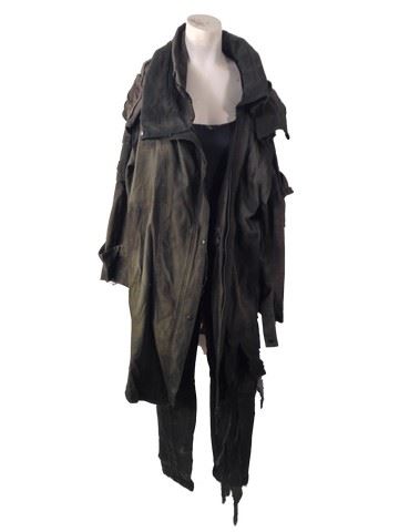 Alice (Milla Jovovich) screen worn, distressed from production green, military cargo coat with patches on both sleeves, faded navy blue tank top, black denim with elastic at the waist with multiple pockets 'Demobaza' jeans. This is the main costume worn by Alice in the film when she is not wearing her catsuit.