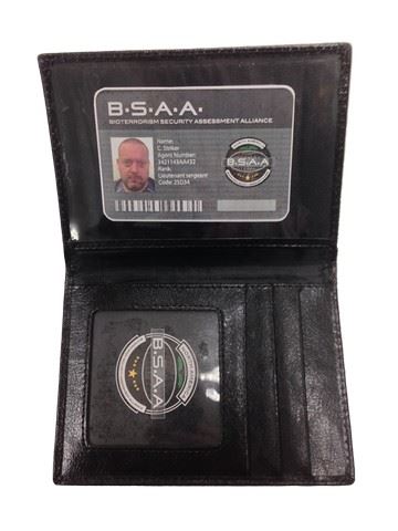 Screen used B.S.A.A. (Bioterrorism Security Assessment Alliance) badge case with printed ID badge for C. Striker, Agent Number and Rank on the inside and B.S.A.A ID card. (Approx. 6"x4")