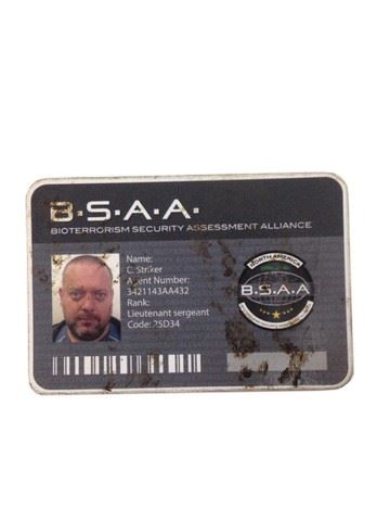 Screen used B.S.A.A. (Bioterrorism Security Assessment Alliance) ID Card. Name printed: C. Striker with Agent Number and Rank. (Approx. 4"x2.5")