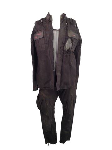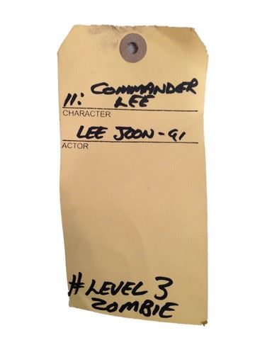 Commander Lee (Joon-Gi Lee) screen worn, hero, level 3 zombie transformation costume that includes a black bloodied and production distressed shirt, black pants with a black belt, and a silver colored piece of chest armor. Wardrobe tag included.