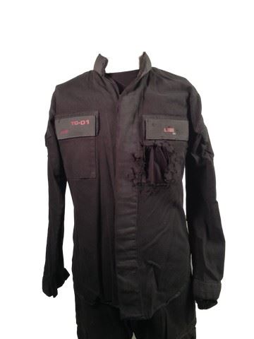 Commander Lee (Joon-Gi Lee) screen worn, hero, level 2 blast costume that includes a black bloodied and production distressed shirt, black pants, and a silver colored piece of chest armor. Wardrobe tag included.