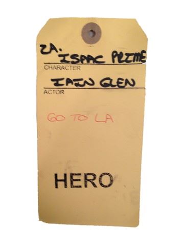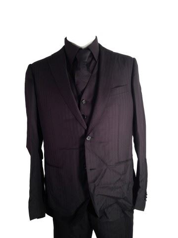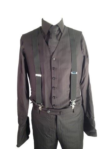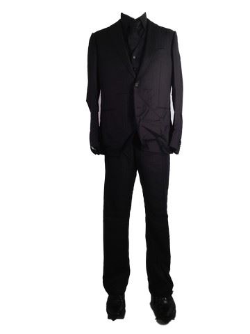 Dr. Alexander Isaacs (Iain Glen) screen worn, prime, hero, black Caruso coat(42reg). Includes a Corducci black dress shirt(41), slacks(52,7R), and a Caruso black vest with pink lining. Also, includes Trenery dress shoes(44), suspenders, a black Corducci tie, and Robert Daniel cuff links with Umbrella Corporation stickers included. Wardrobe tag included.
