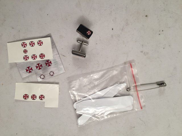 Dr. Isaacs (Iain Glen) screen worn, prime level 1 hero costume. Includes a black 'Carducci' long sleeved dress shirt (size 41), dark grey 'Caruso' tie, black suspenders, black 'Caruso' suit jacket , black vest eggplant purple 'BEMBERG" fabric lining and cuff links with 'Umbrella Corporation' logo, two small sheets of logo stickers. 'Trenery' black dress shoes (size 43). Includes wardrobe tag.