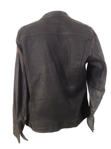 Dr. Isaacs(Ian Glen) Screen worn, stunt, production distressed uniform "Raw", black jean jacket with leather trim and patches, umbrella patch on the left arm and patch on both sides of the chest one that reads"Dr Isaacs A.E.", and a bar code underneath, the other side has his genetic info.(xxl)