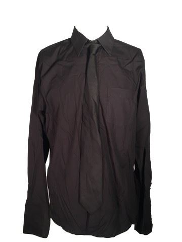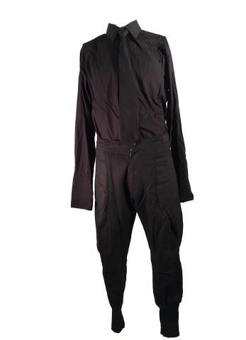 Dr. Isaacs (Iain Glen) screen worn, prime level 1 hero black 'Carducci' long sleeve dress shirt (size 43) and 'Caruso' black tie with black riding pants (prime level 2, part 2) with built-in suspenders. Includes wardrobe tags.