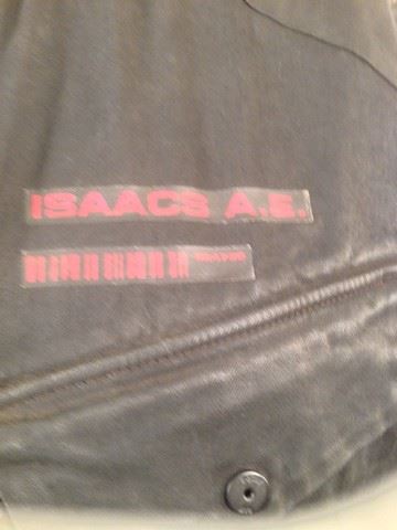Dr. Isaacs(Ian Glen) screen worn, stunt, production distressed uniform "Raw", black jean jacket with leather trim and patches, umbrella patch on the left arm and patch on both sides of the chest one that reads"Dr Isaacs A.E.", and a bar code underneath, the other side has his genetic info.(xxl)