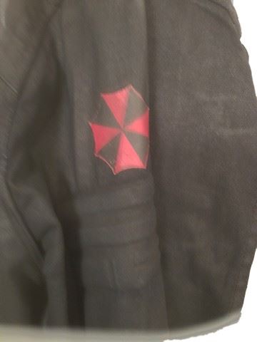 Dr. Isaacs(Ian Glen) screen worn, stunt, production distressed uniform "Raw", black jean jacket with leather trim and patches, umbrella patch on the left arm and patch on both sides of the chest one that reads"Dr Isaacs A.E.", and a bar code underneath, the other side has his genetic info.(xxl)