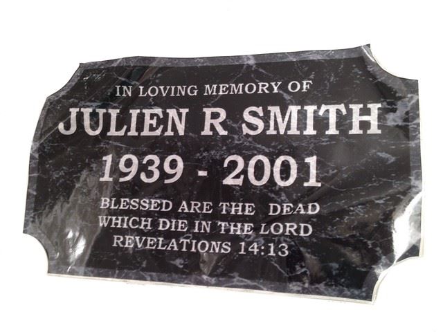 " In Loving Memory of Julien R Smith 1939-2001, blessed are the dead which die in the lord Revelations 14:13" gravestone sticker, unused. (Approx. 16" x 9.5")