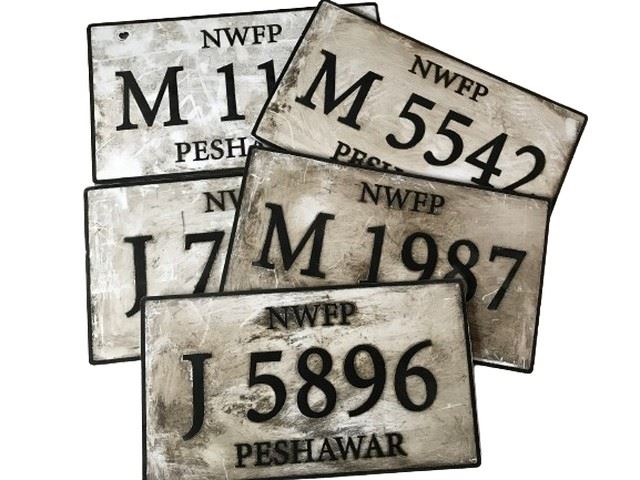 Lot of five screen used Pakistan vehicle license plates. Metal like material.
