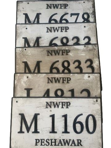 Lot of five screen used, Pakistani vehicle license plates. Made of plastic/resin. One matching pair.