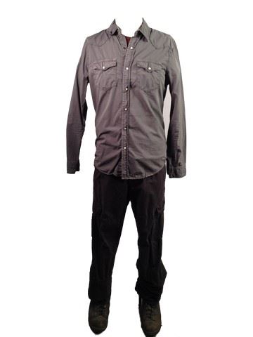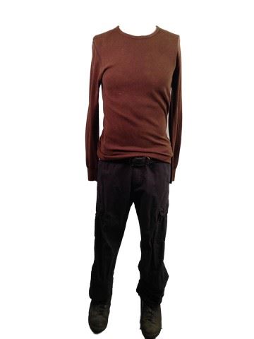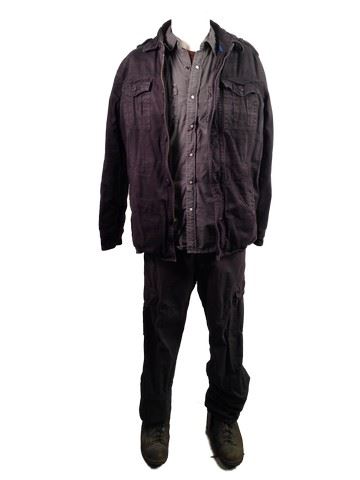 Sergei (Robin Kasyanov) screen worn production distressed black jacket, a grey button up shirt, brown long sleeve thermal, a pair of dark blue pants, a brown beanie and a pair of boots(12). Wardrobe tag included.