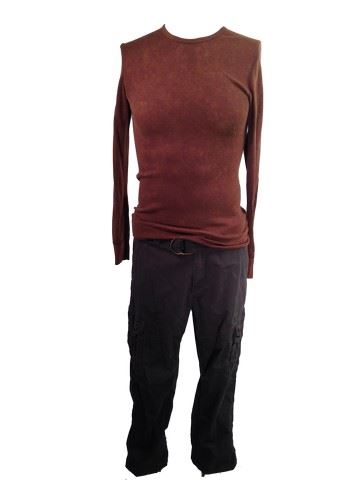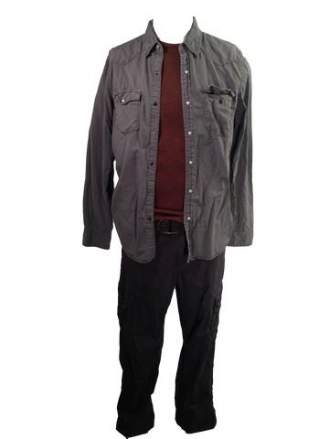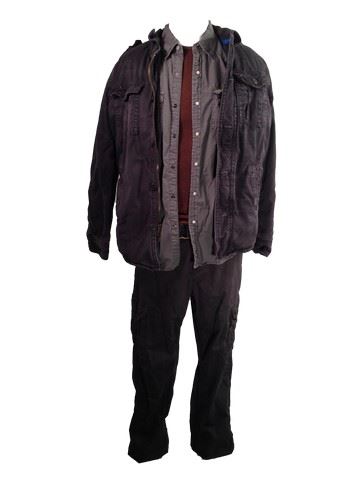 Sergei's (Robin Kasyanov) screen worn production distressed black jacket, a grey button up shirt, brown long sleeve thermal, a pair of dark blue pants, and a brown beanie.