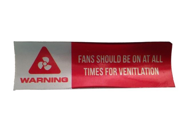"Warning: Fans should be on at all times for venitlation" unused sticker. (Approx. 4" x 1")