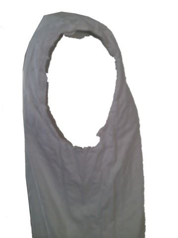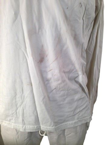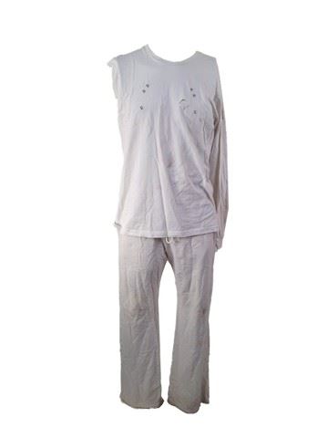 Screen worn, survivor outfit:(XL) cotton"J Crew" white pants and cotton shirt, each shirt has a barcode on the left shoulder with 3 numbers and right arm of shirt has been ripped off for production. Oufits are production soiled with dirt and blood stains.