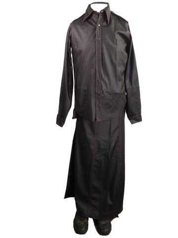 Umbrella Trooper screen worn, black leather tear away pleather skirt, black pleather tear away jacket, pleather pants, black webbing with gromett detail belt and web belt. Includes a pair of black 'Oakley' boots. Used in both Resident Evil: Retribution and The Final Chapter. (fits approx. size L, boots approx. size 9-11)