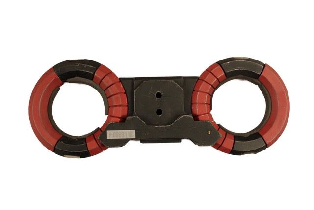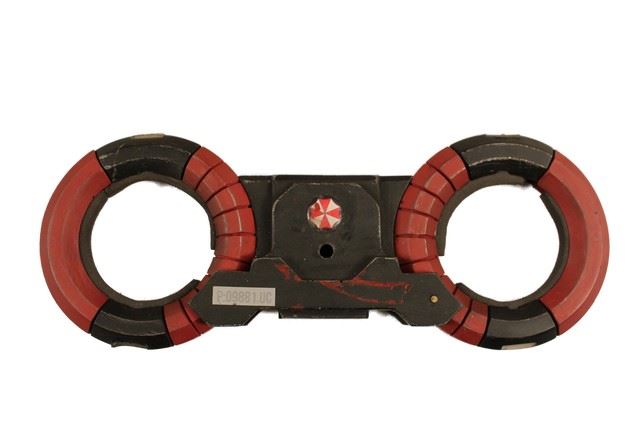 Umbrella Corporation screen used manacles(handcuffs) with Umbrella Corporation symbol and LED. (Non-functioning hard plastic cuffs) (Approx. 12" x 5") . Last pair of intact manacles available from this film.