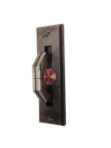 Screen used, Umbrella logo, production soiled and distressed door handle made for the production by the set dressing department. "Umbrella Corporation" engraved on the bottom. Handles are glued to the base for production purposes. (10"x3")