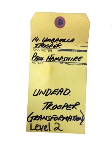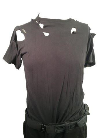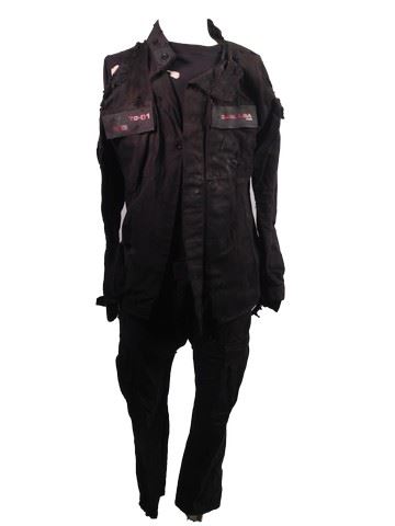 Undead Trooper (Paul Hampshire) screen worn, bloodied and torn, undead trooper costume. Includes a black front button shirt with patches, black cargo pants, a ripped black t-shirt, a black belt and a pair of black cargo pants. Wardrobe tag included.