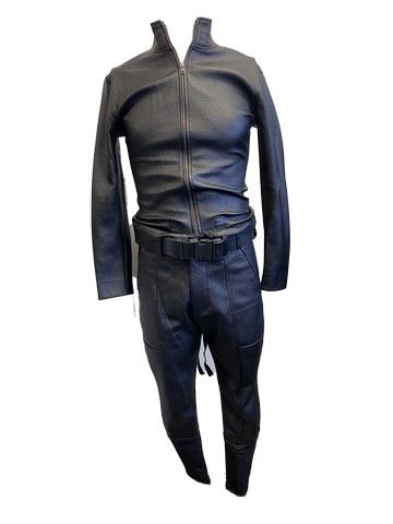 Wesker's (Shawn Roberts) double's screen worn custom made, black quilt pattern jacket and pants with leather belt that buckles in front.