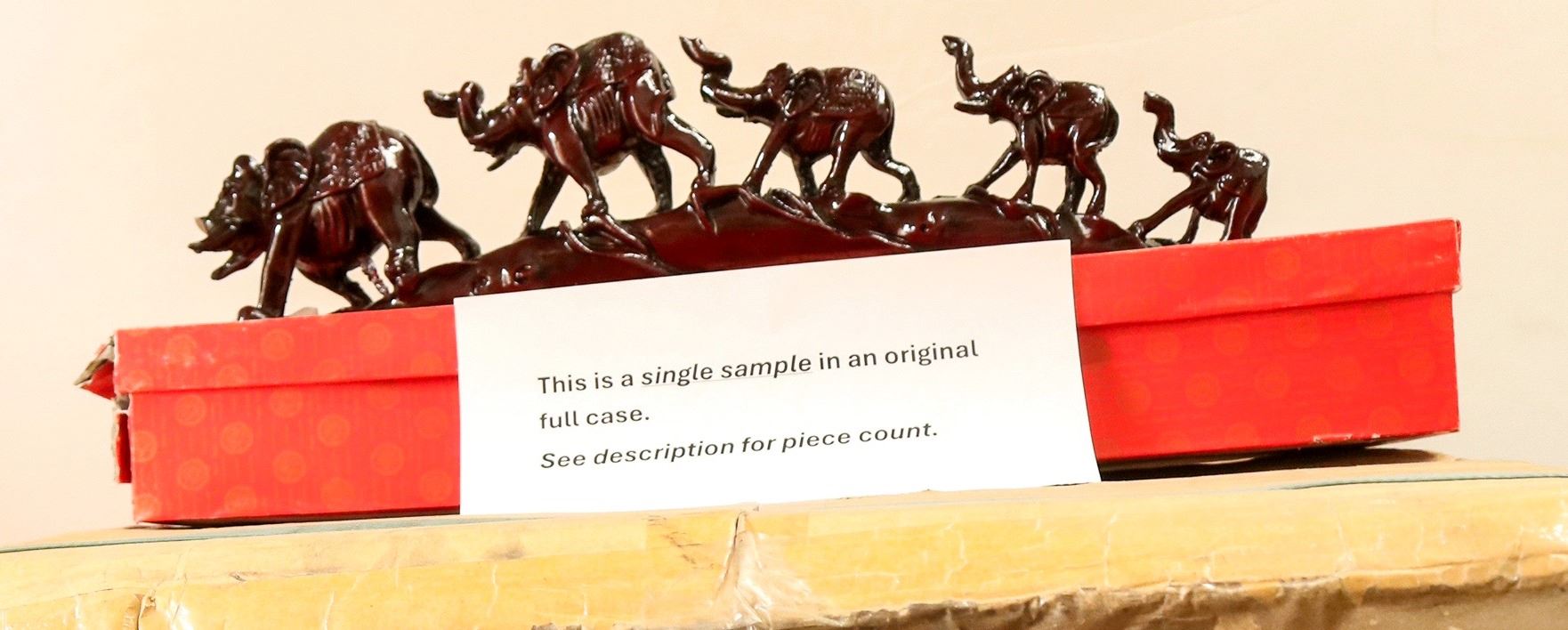 12 sets of 5 Resin elephant trains, 4x17", in original boxes. These items have been in storage for 20 years and have not been inspected. Sold as is.