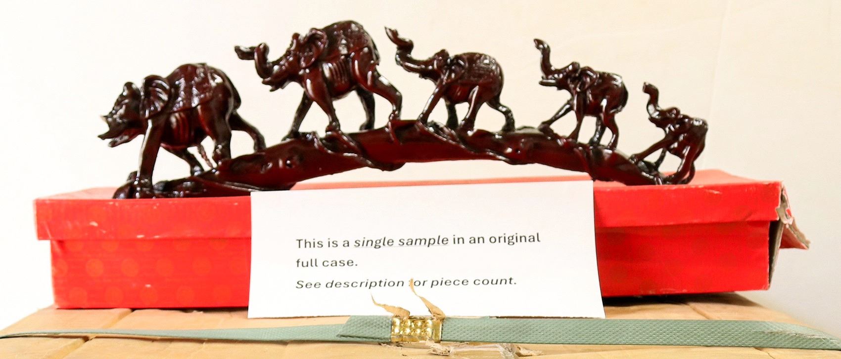 12 sets of 5 Resin elephant trains, 4x17", in original boxes. These items have been in storage for 20 years and have not been inspected. Sold as is.