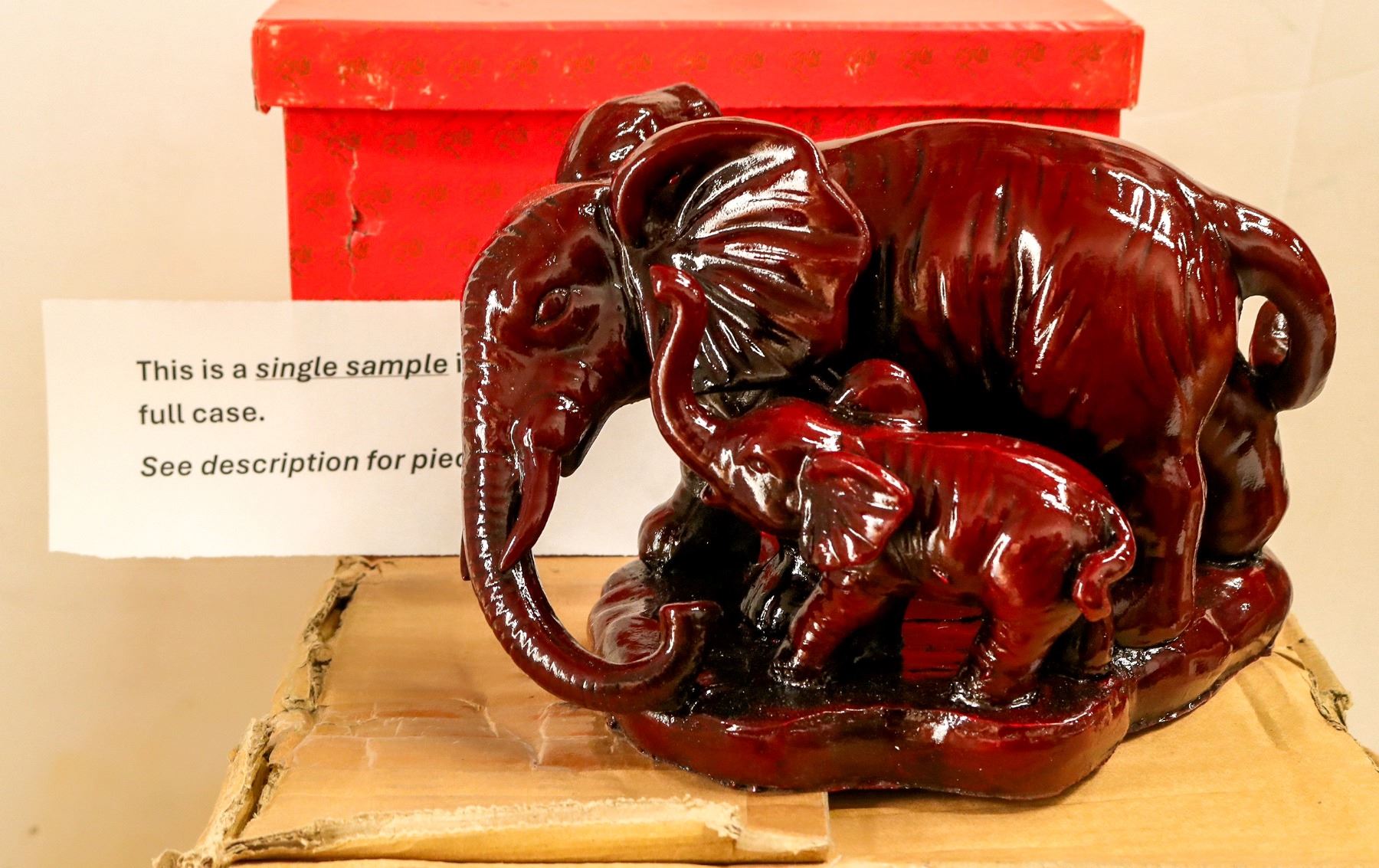 4x large, 6.75x9x5.75" resin elephants with baby. These items have been in storage for 20 years and have not been inspected. Sold as is.