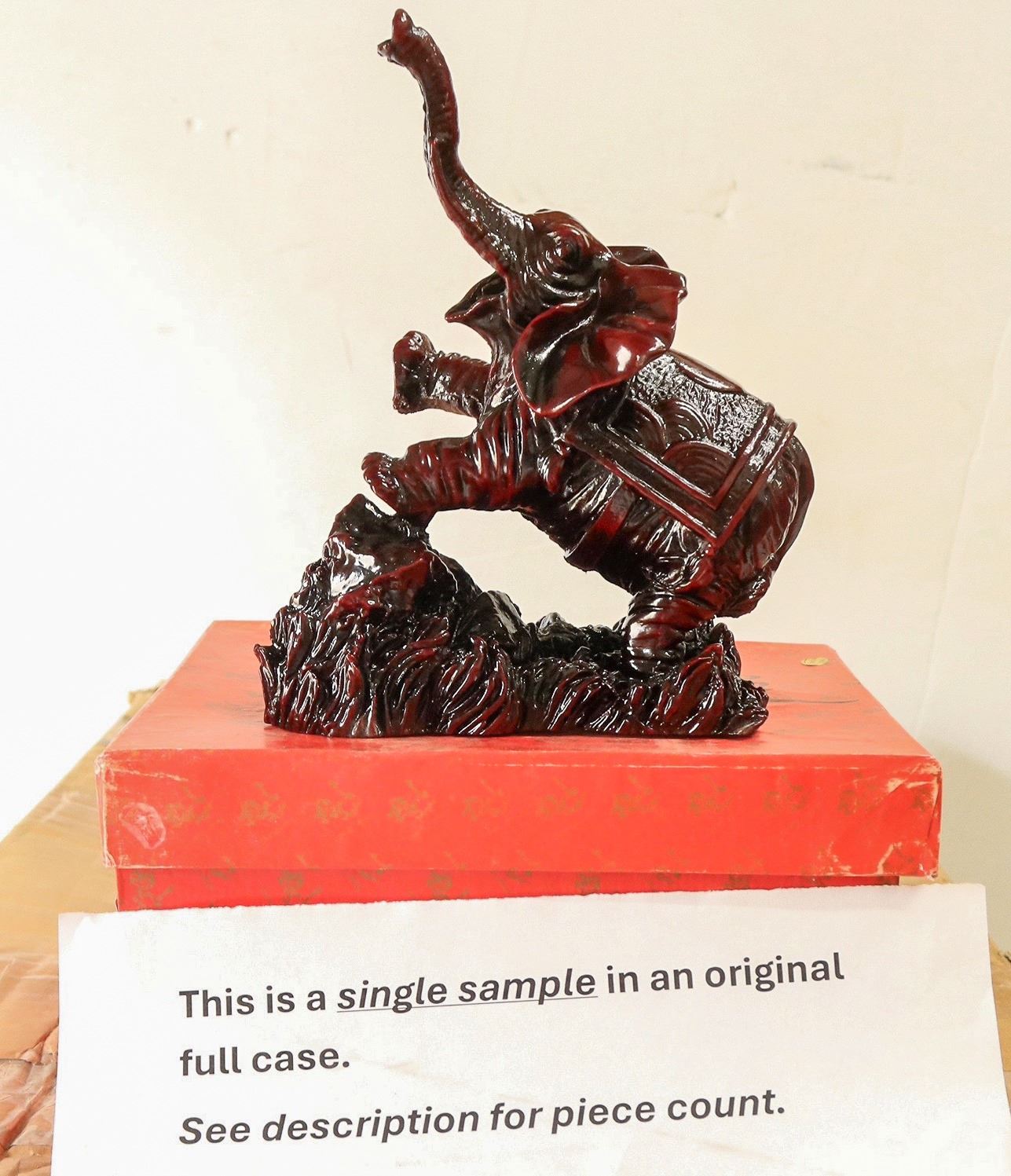24 Resin elephants. 4.5x6.5z3" in original boxes. These items have been in storage for 20 years and have not been inspected. Sold as is.