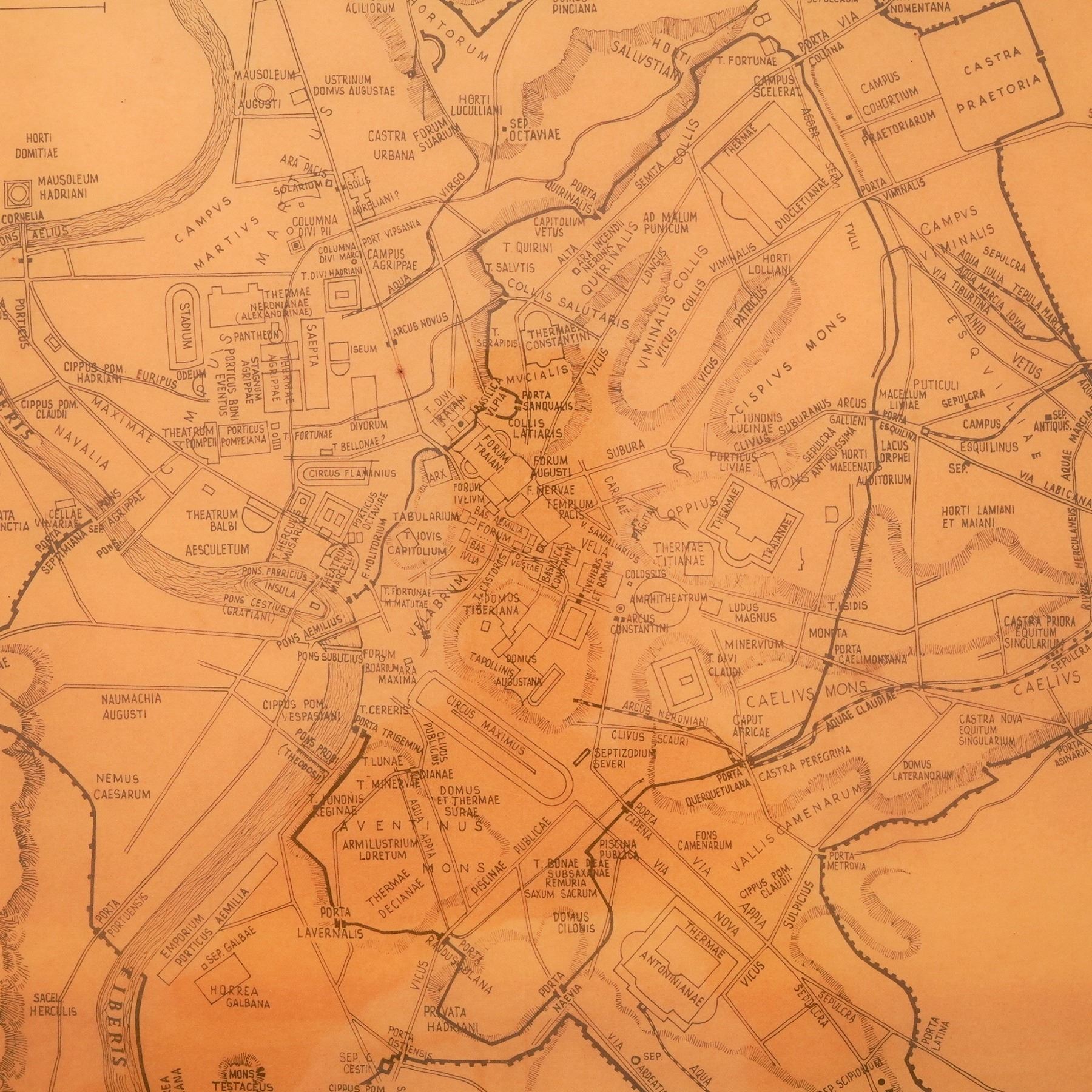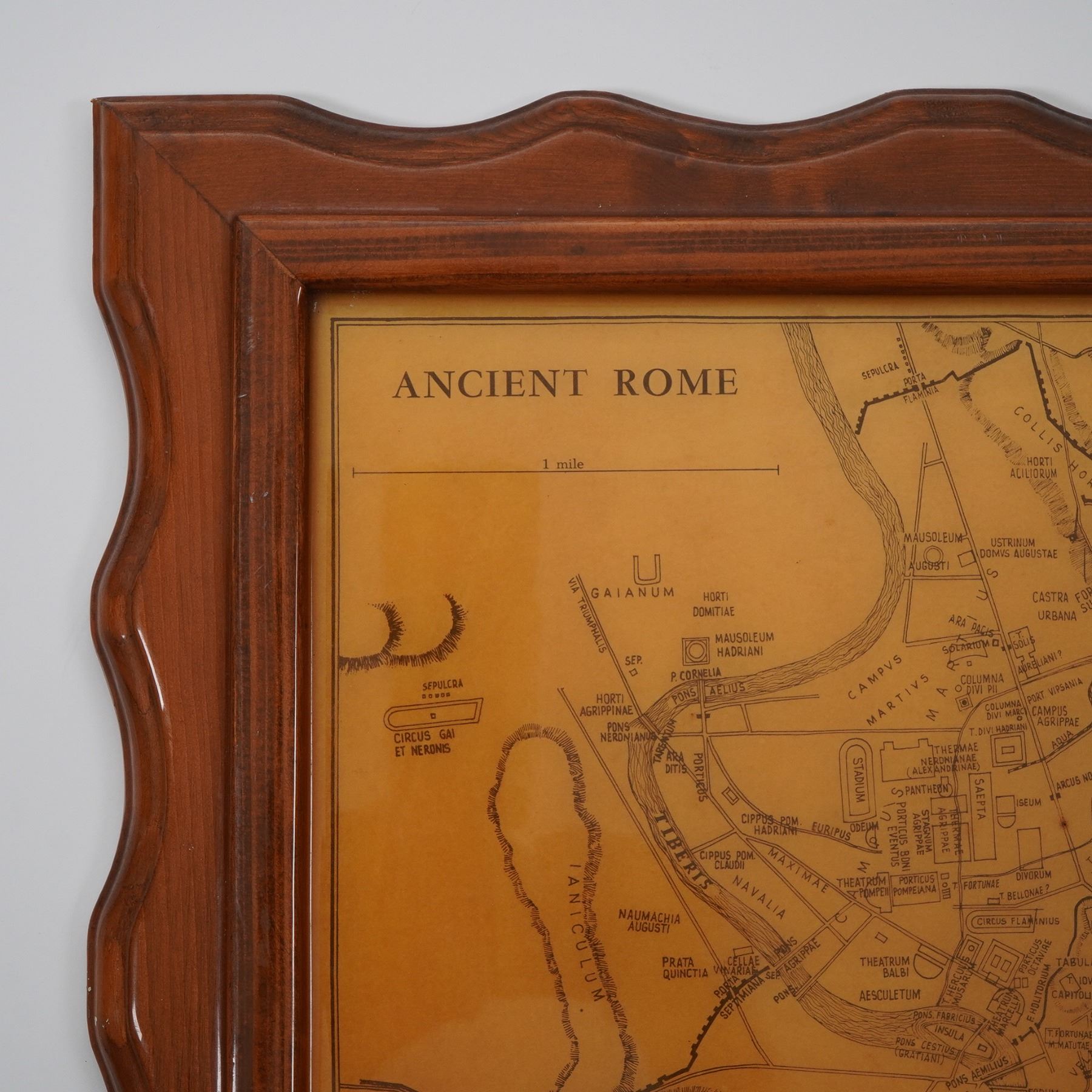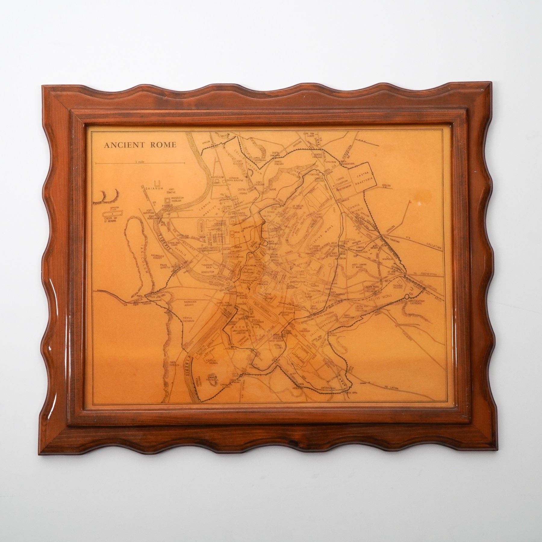This vintage map of Ancient Rome is uniquely encased in resin within an ornate wooden frame, preserving its detailed depiction of the city's ancient landmarks, roads, and structures. The warm sepia tones and intricate historical layout make this piece both an educational and decorative addition to any space. The wavy-edged wooden frame adds to its antique charm. A perfect find for history enthusiasts and collectors of vintage cartography. Measures 21.75"L x 18"H.