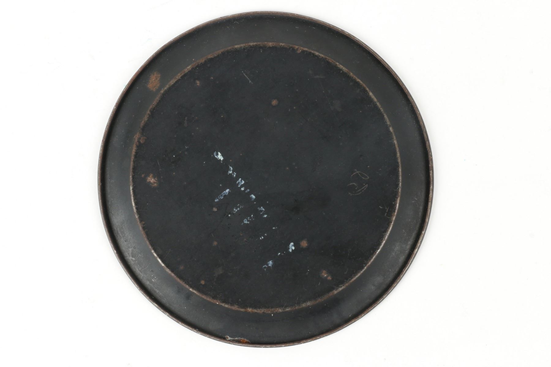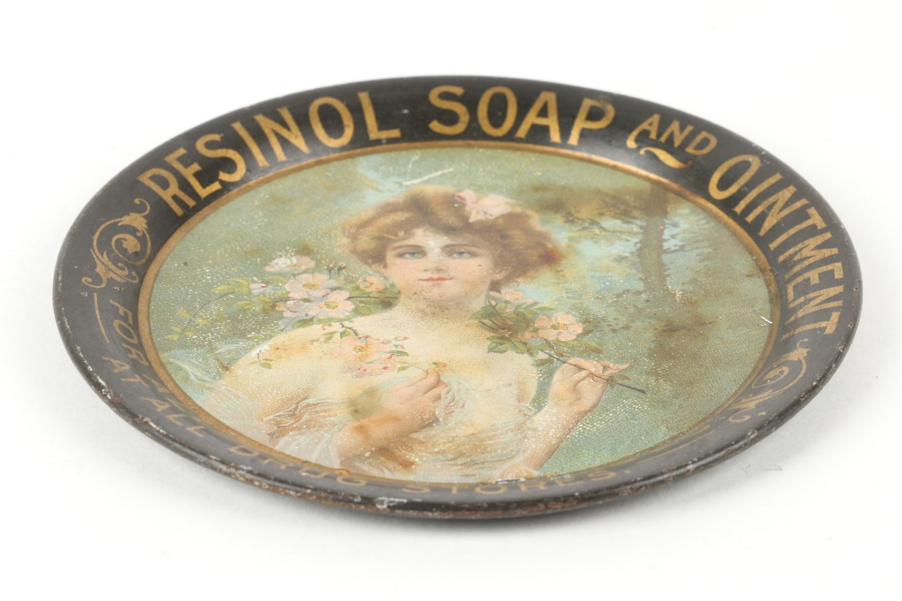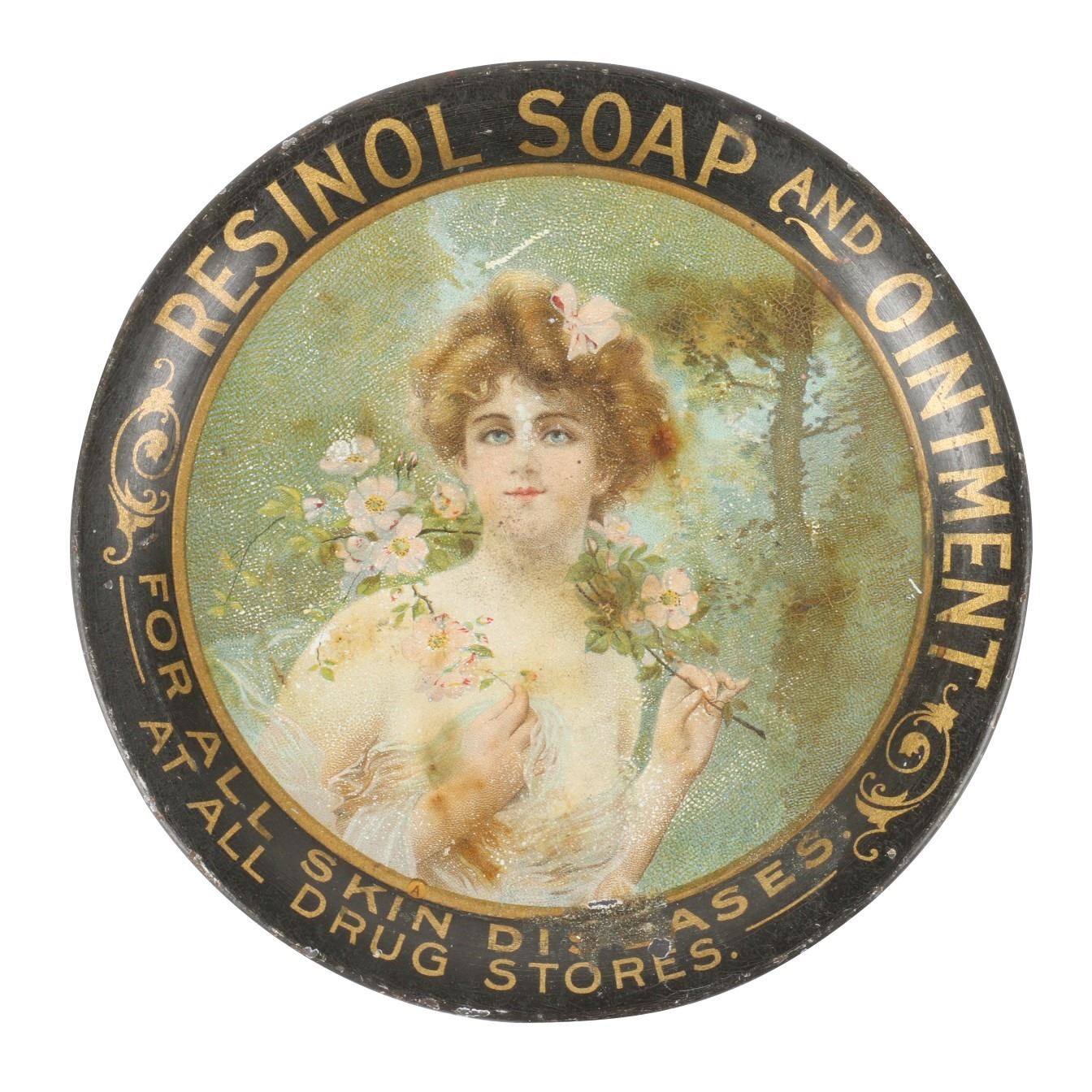 Circa 1910. Advertising soap and ointment. 4” dia. Burn abrasions. Typical crazing. Scattered surface flakes. Oxidation, including a blemish to lower quarter. $100-200.