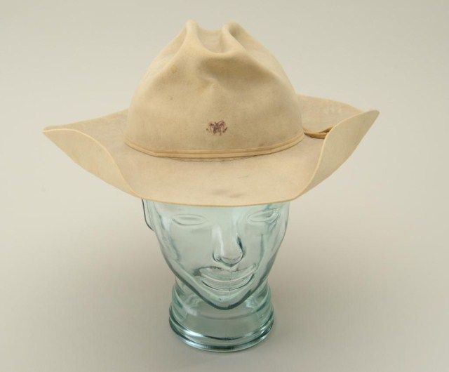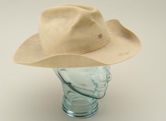 Resistol beaver “35” off-white cowboy hat in worn but overall good condition with small ink drawing of ram’s head on the front of the hat by noted Western artist, Michael Coleman, formerly in the ClearwaterPublishing Company collection. Est.: $50-$75.