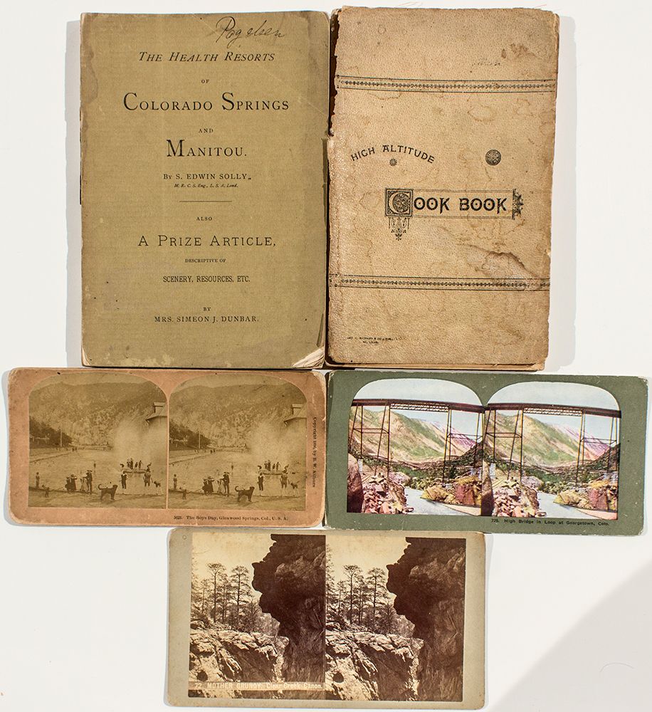 1887 This is a lot of five items including three Colorado stereo views, one of Clear Creek Canyon, one of the railroad bridges at Georgetown and one showing a boys’ day at Glenwood Springs. The lot also includes a 137 soft cover publication entitled The Health Resorts of Colorado Springs and Manitou and a soft cover with bindery issues of a book titled High Altitude Cookbook. This is an interesting lot. The only thing for the purchaser is to figure out what to set their oven at, as the cookbook gives no temperature settings. - HKA#65152