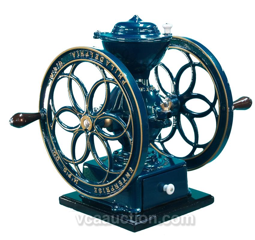 Restored Enterprise 2 Wheel Coffee Grinder - Green w/ Gold Painted Trim