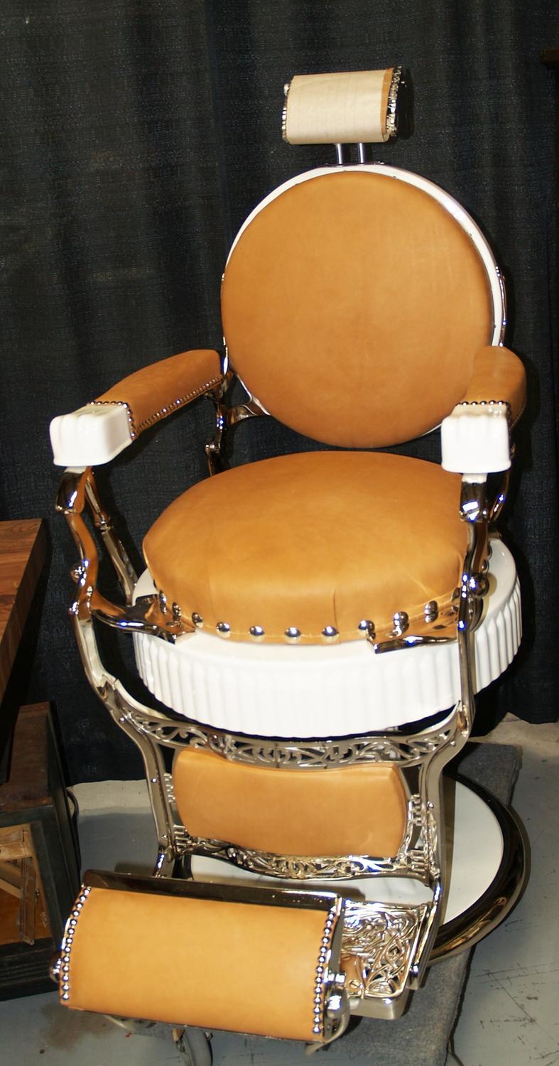 Restored Koken Fluted Round Seat/back Barber Chair  Done in Creamy White, Nickel Plating and Genuine Tan Leather Upholstery (restored to match lot 875, the child's fluted chair)   This is the hardest to find of all the Koken Chairs....