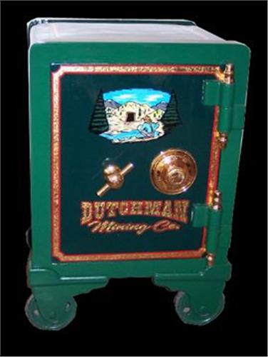 Restored small safe approx 22 " tall artwork depicts a miner panning for gold