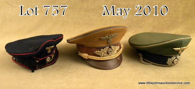Restorer’s lot consisting of a German army infantry officer’s visor cap with no bill, has insignia and cord. Otherwise good. A German railway official’s visor cap complete with visor and chinstrap but shows very heavy worn condition. Also a political leader’s visor cap- visor detached but very restorable. Body of political leader’s cap is very good plus condition. Est: $350 - $700
