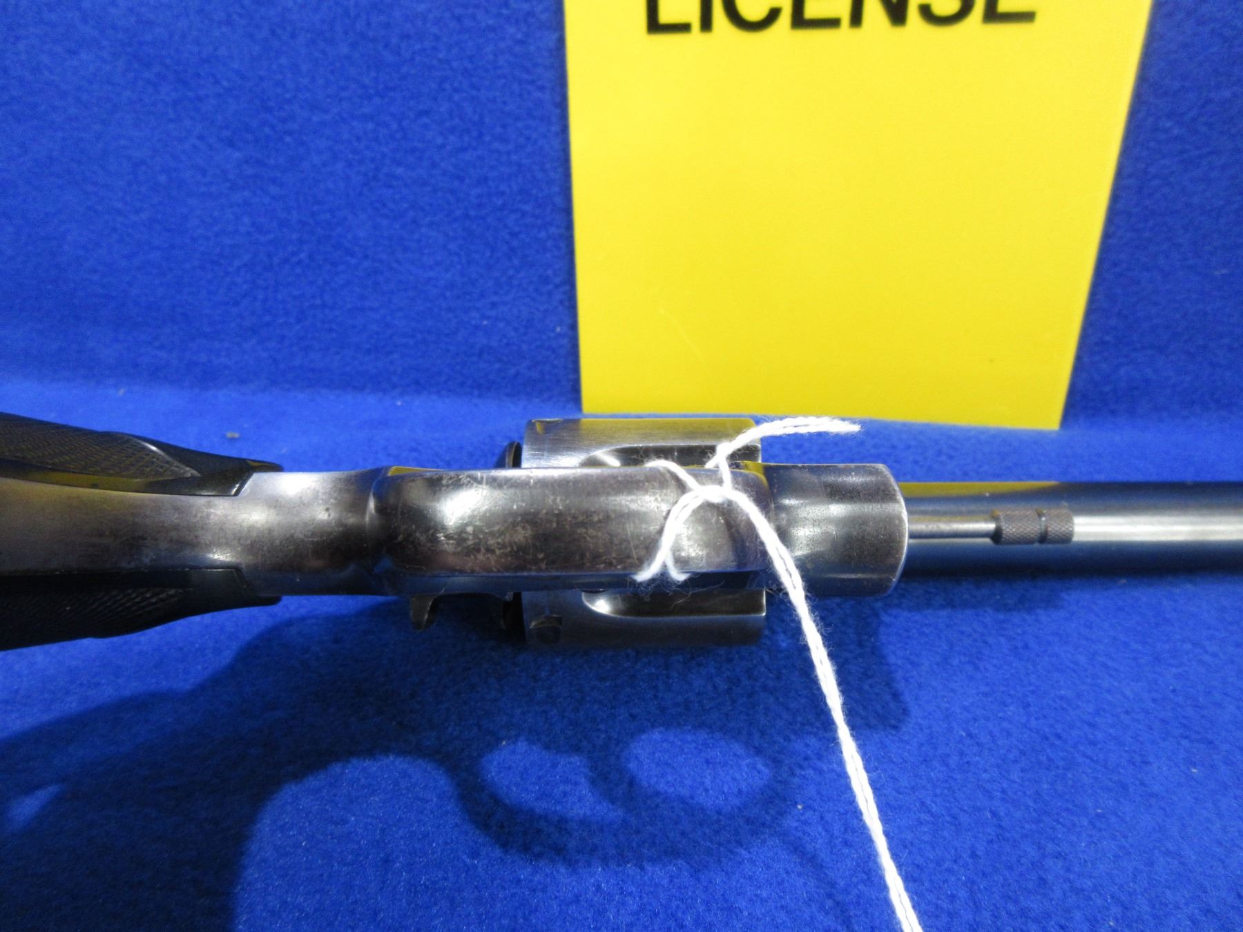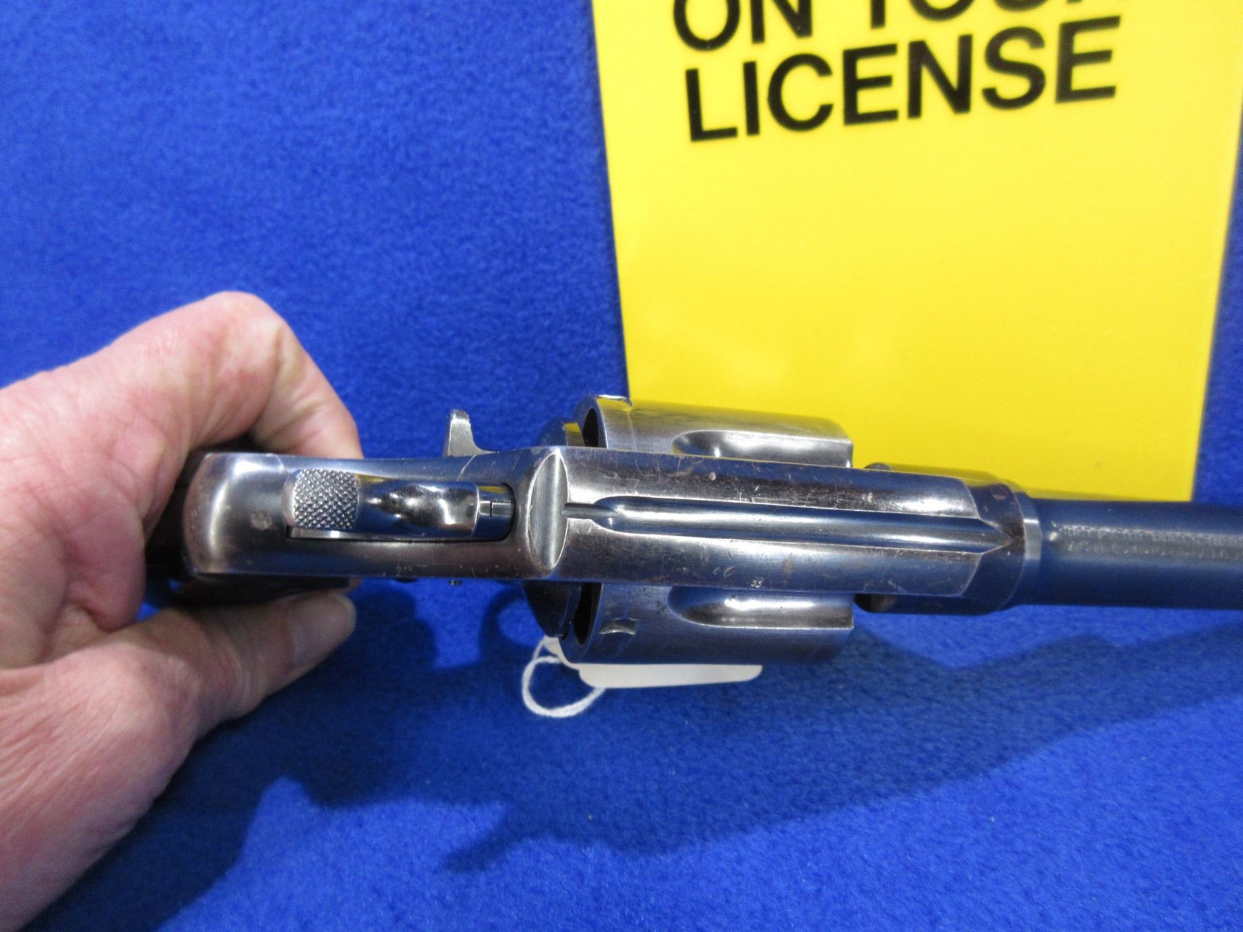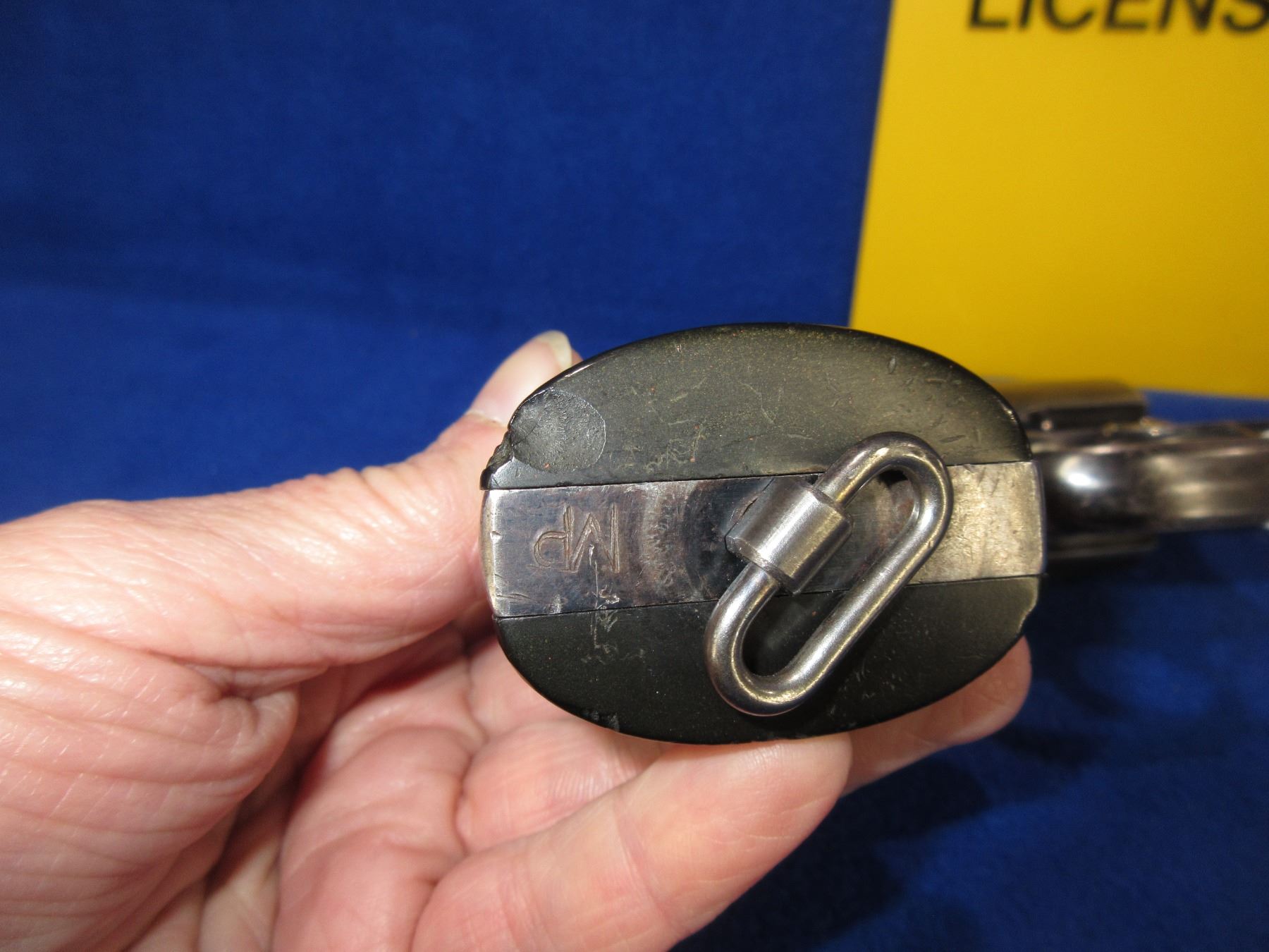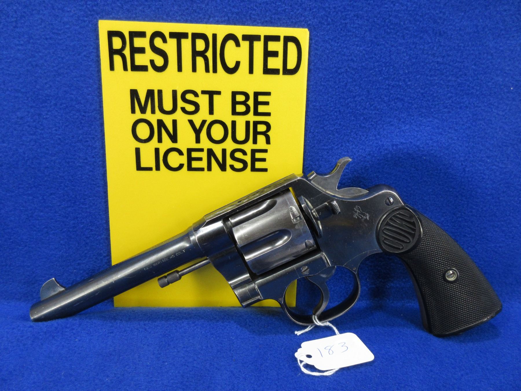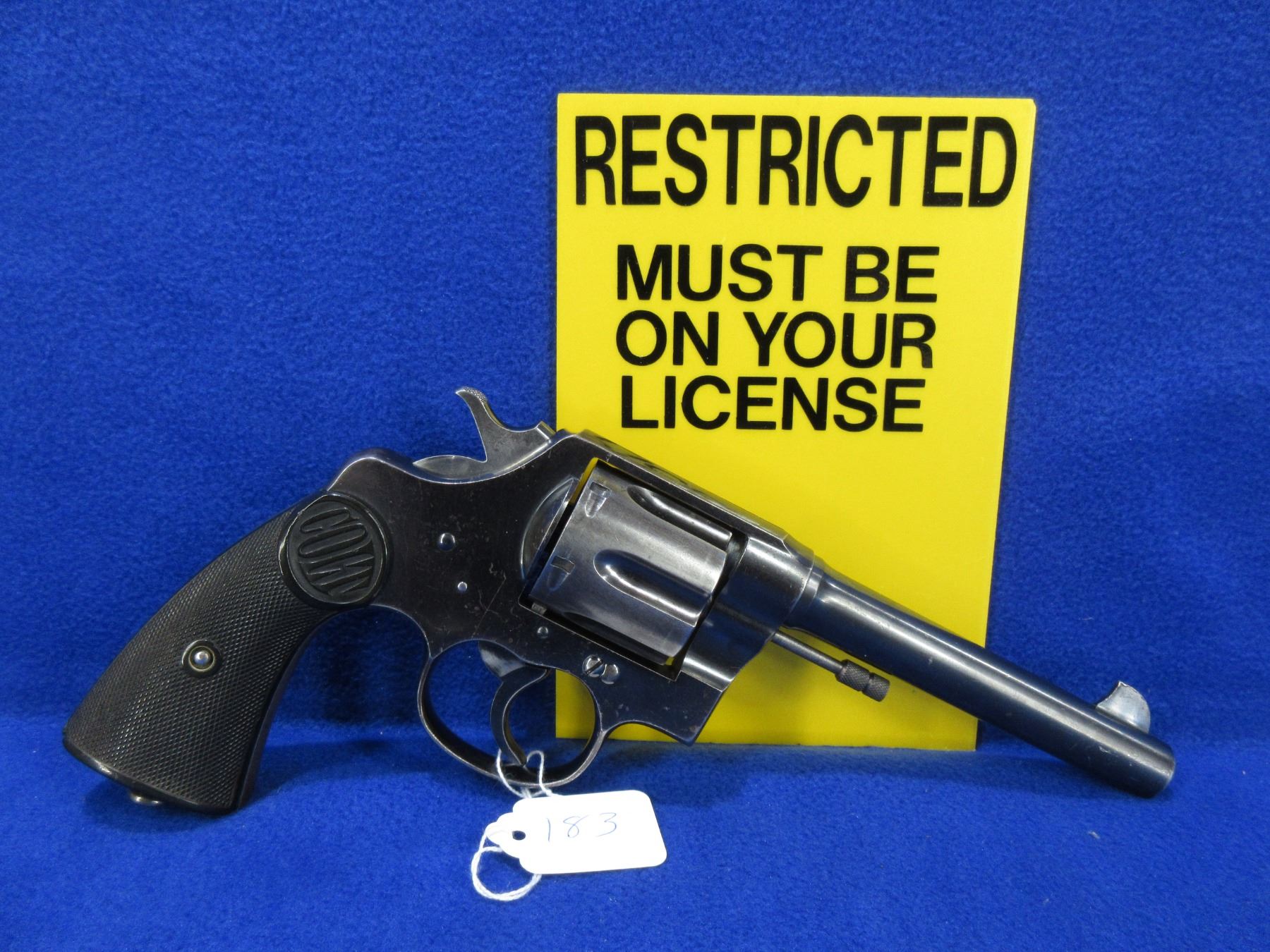 Restricted - Colt New Service in 45 Colt - Made in 1918 - This 6 Shot Revolver appears to be in very good working order. Barrel is 140MM, rifling very good, bluing good to very good, has fixed sights, black hard rubber grips are good but bottom right grip has chip, stamped MP on bottom of grip, Ser # 147752