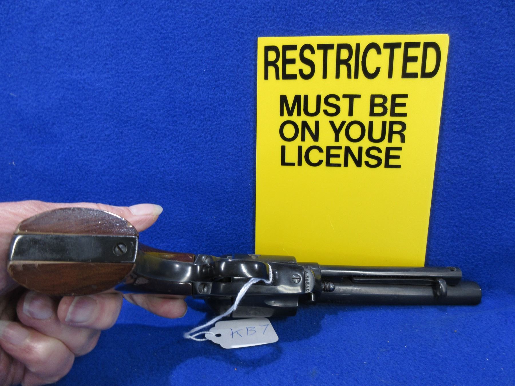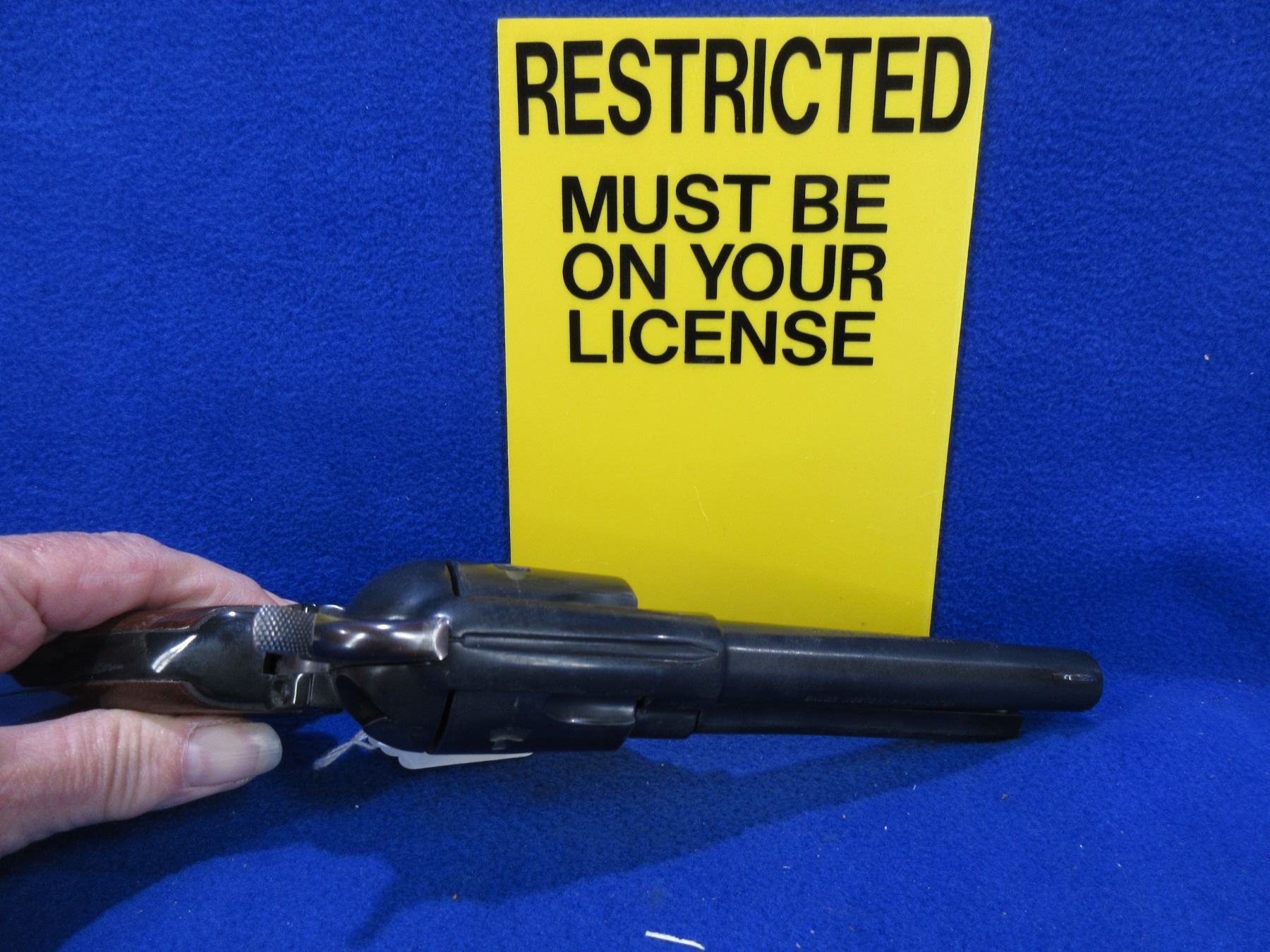 Restricted - JP Sauer & Sohn Western Six-Shooter in 22 LR - This single action 6 shot revolver appears to be in fair working order as cylinder isn't locking up properly and ejector assembly is loose on barrel. Barrel is 150MM, rifling good to very good, bluing good to very good, has fixed sights, wood grips are good. Ser # A16830