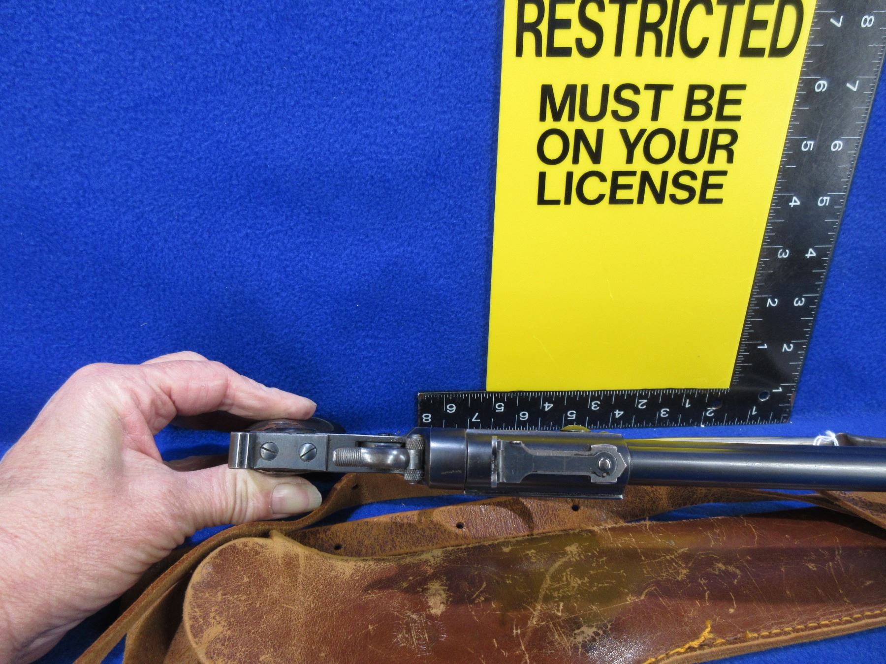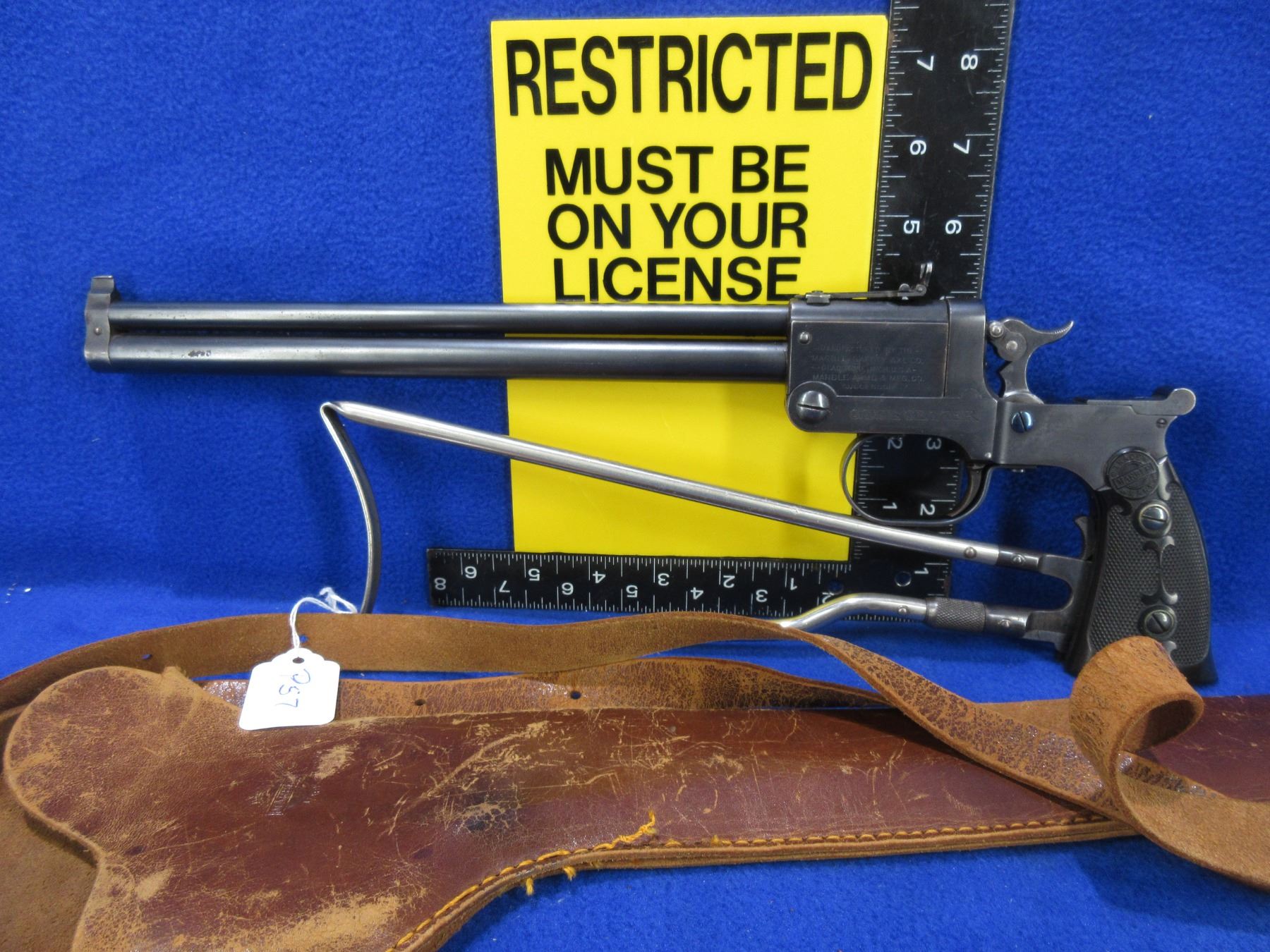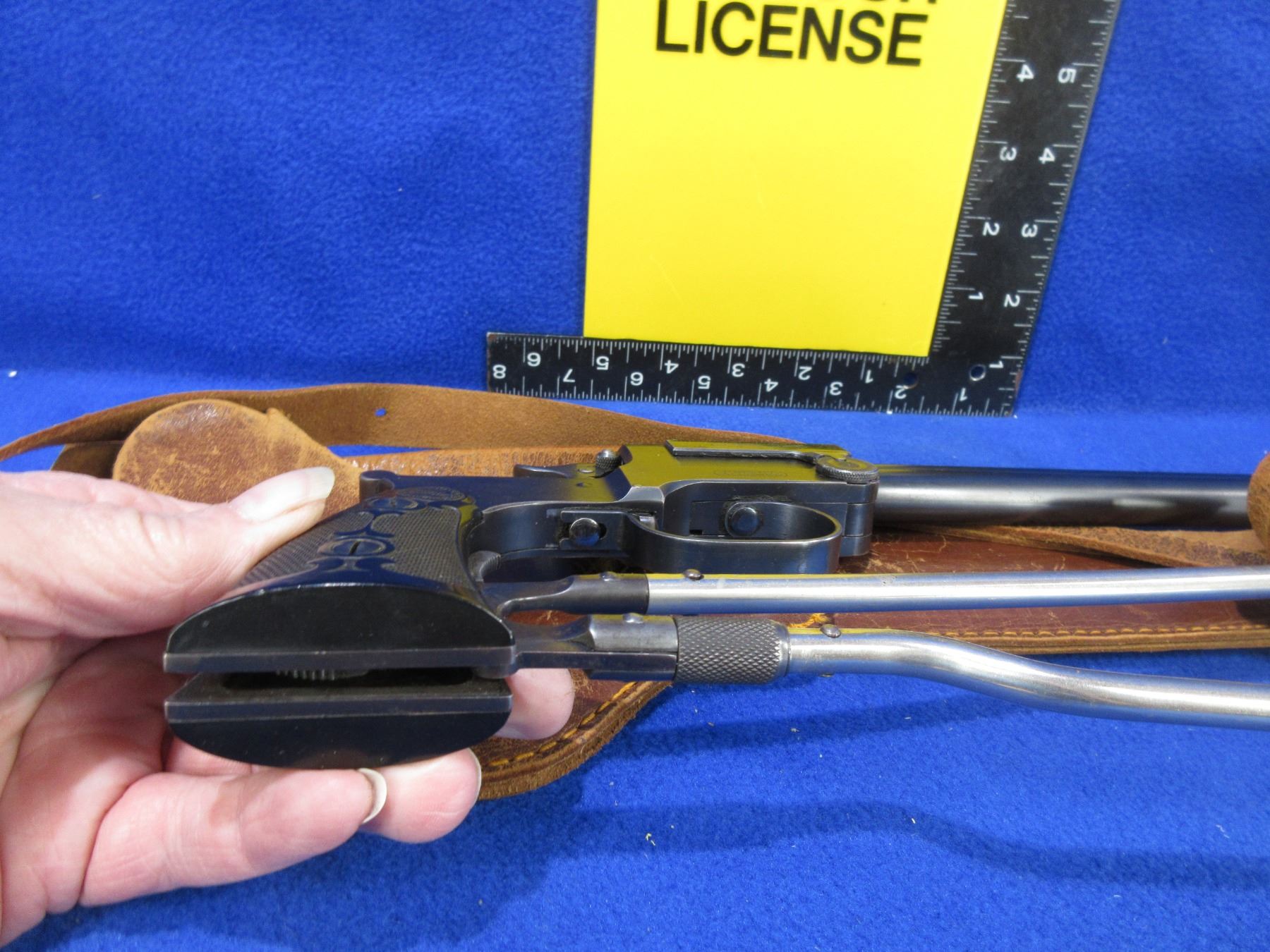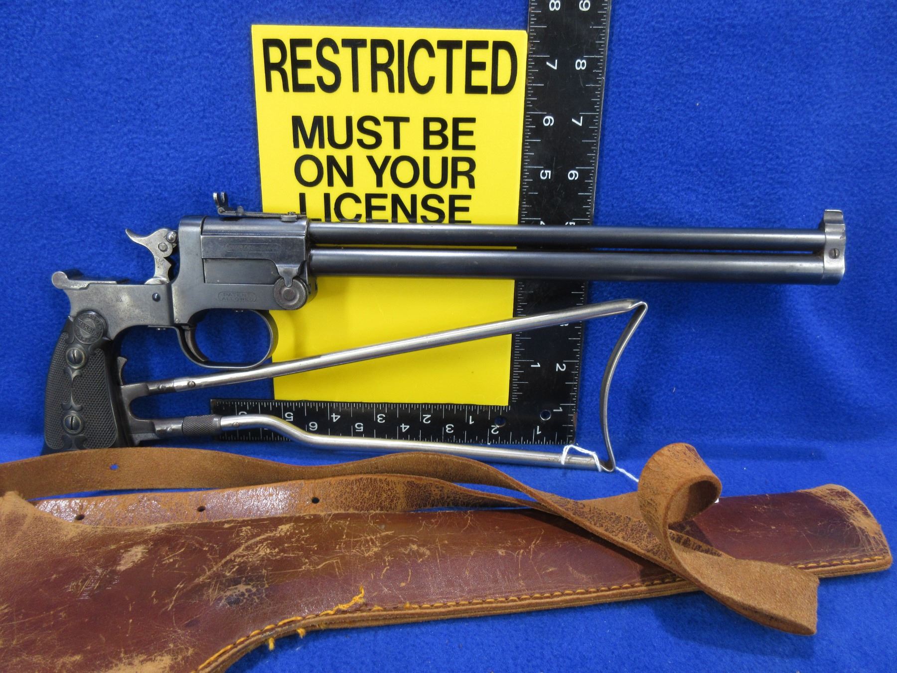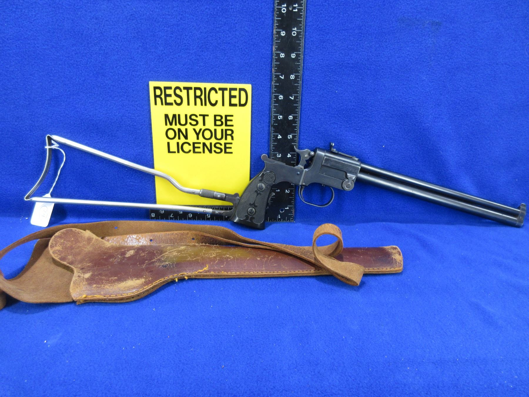 Restricted - Marble Game Getter in 22/44 Cal. - This over under 22/44 cal. pistol appears to be in good to very good working order. Barrel is 305MM, 22 rifling is approx. 60% as it has corrosion damage, 44 bore is shiny, bluing is good to very good, has fixed front sight, adjustable rear sight, synthetic grips are very good, comes with shoulder holster. Ser # 9858