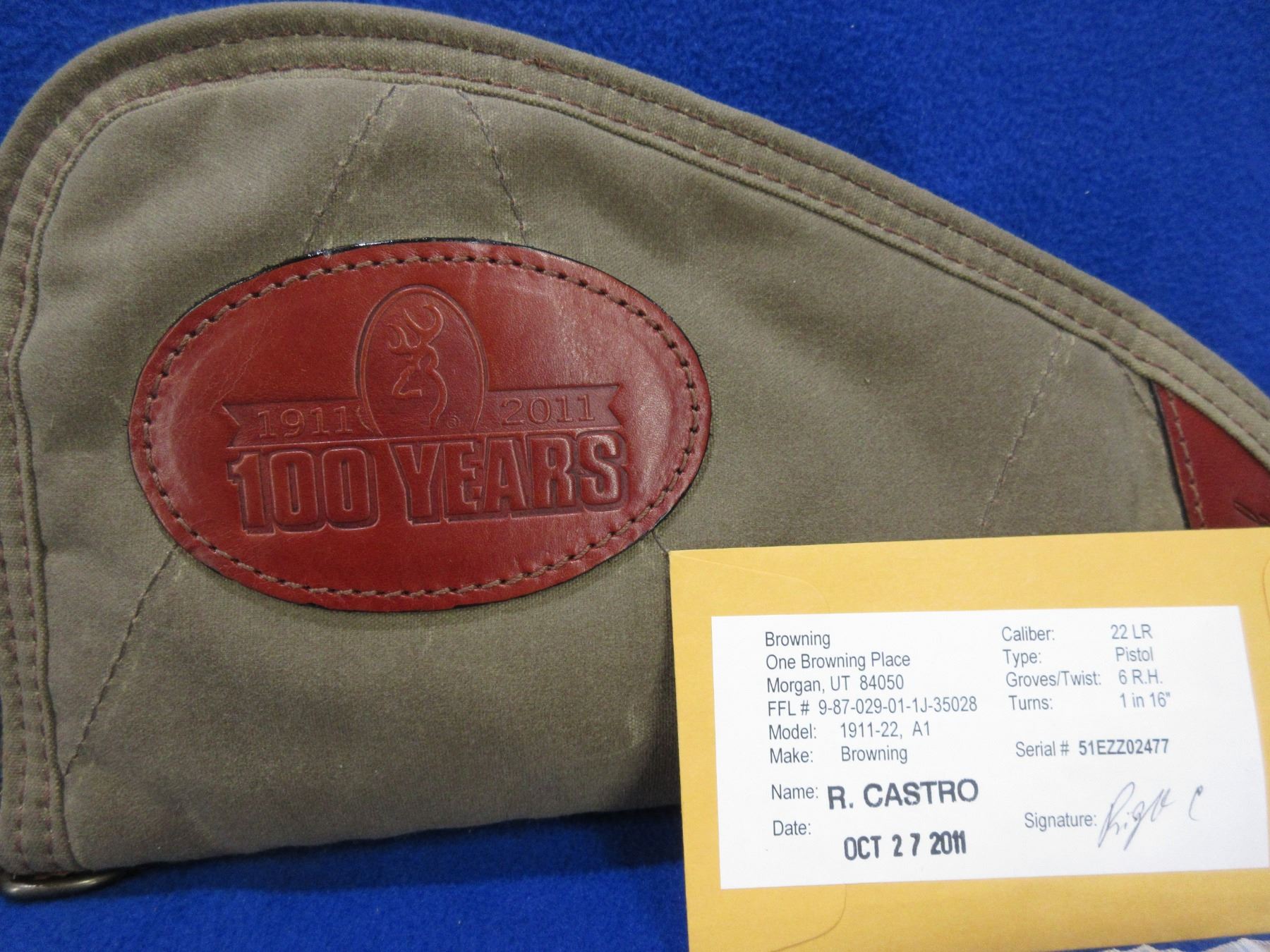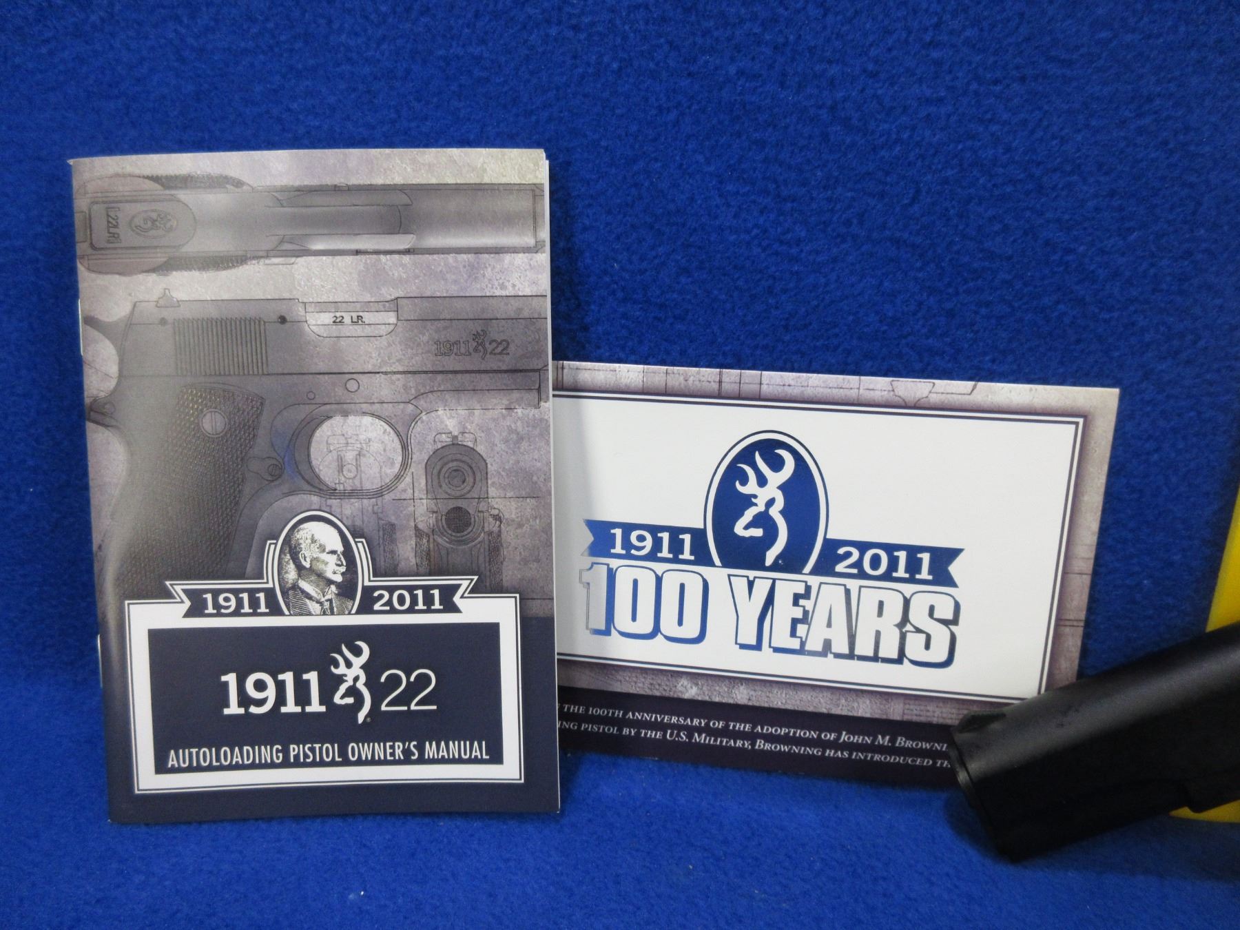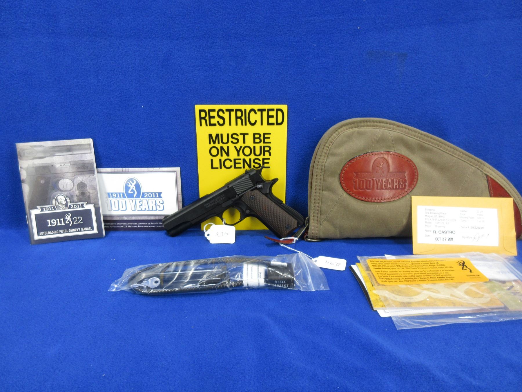 Restricted - NEW Browning 1911-22 in 22 LR - This semi auto pistol with magazine is NEW in box. 1911-2011 100 Years Anniversary Edition. Barrel is 108MM, has fixed front sight, adjustable rear sight, synthetic grips, comes with original anniversary case, paperwork and cable lock. Ser # 51EZZ02477