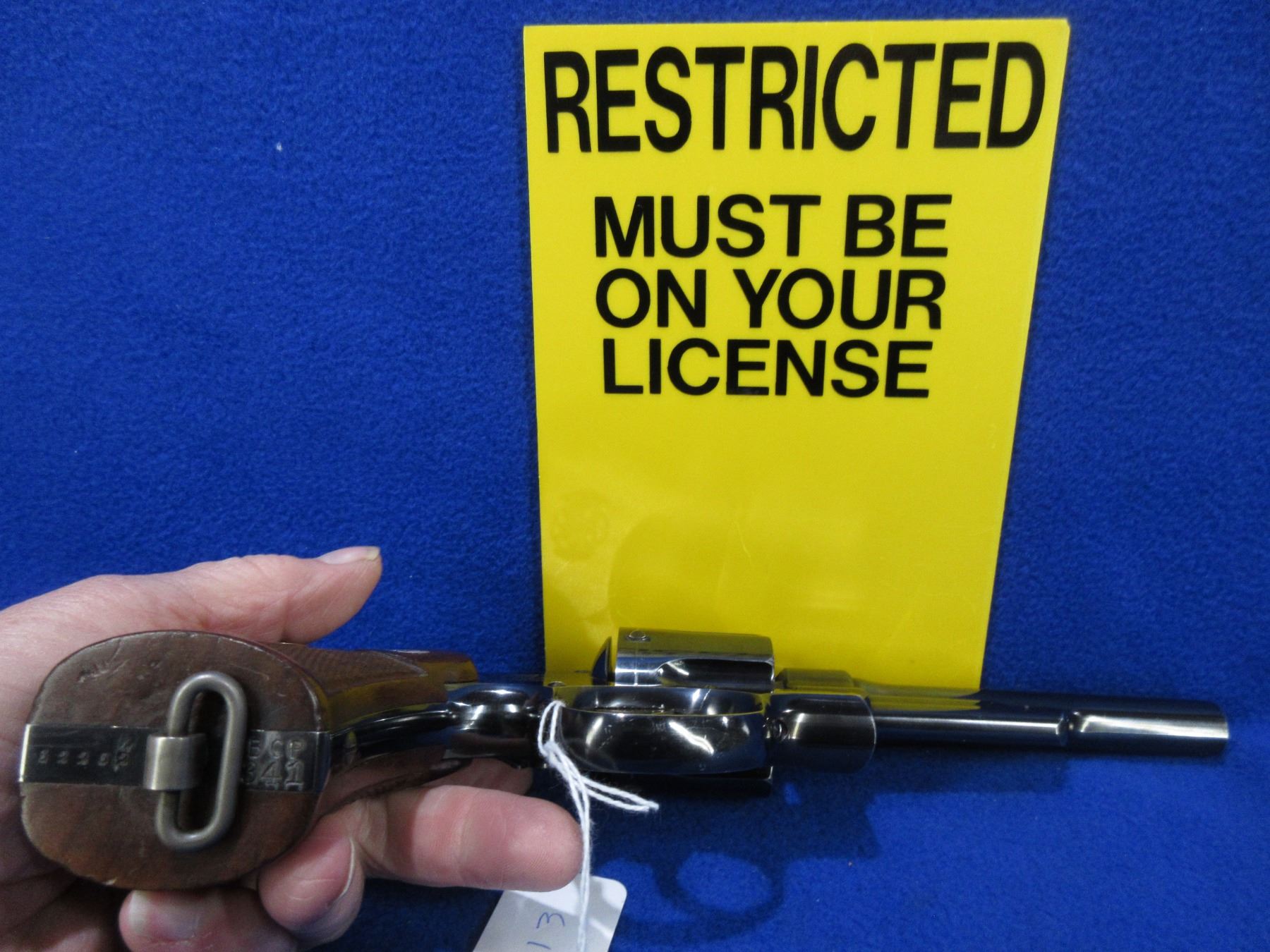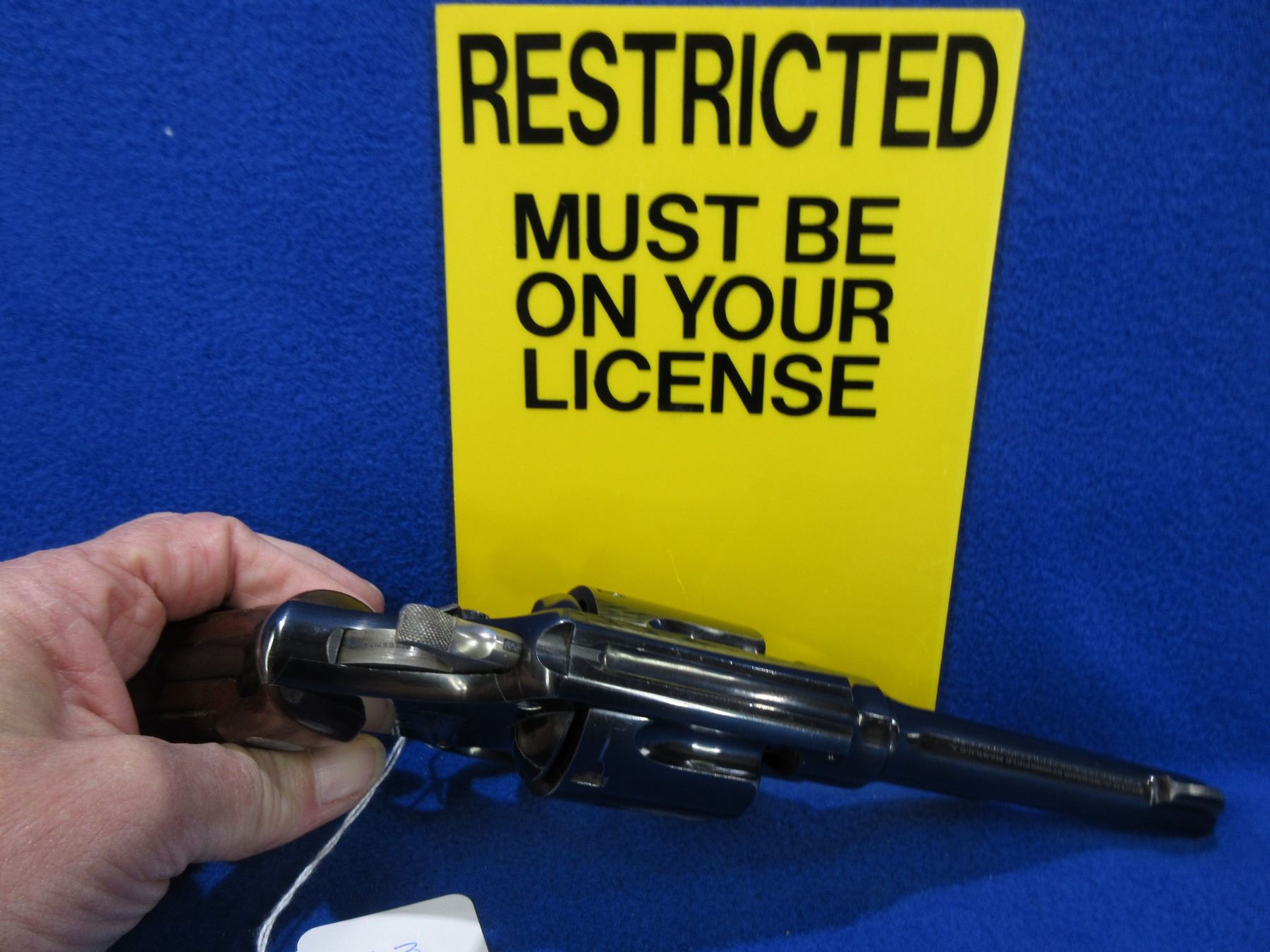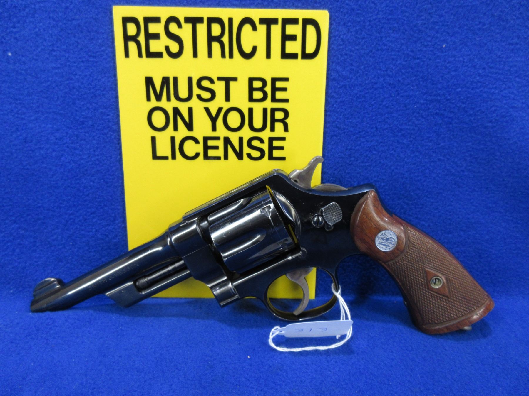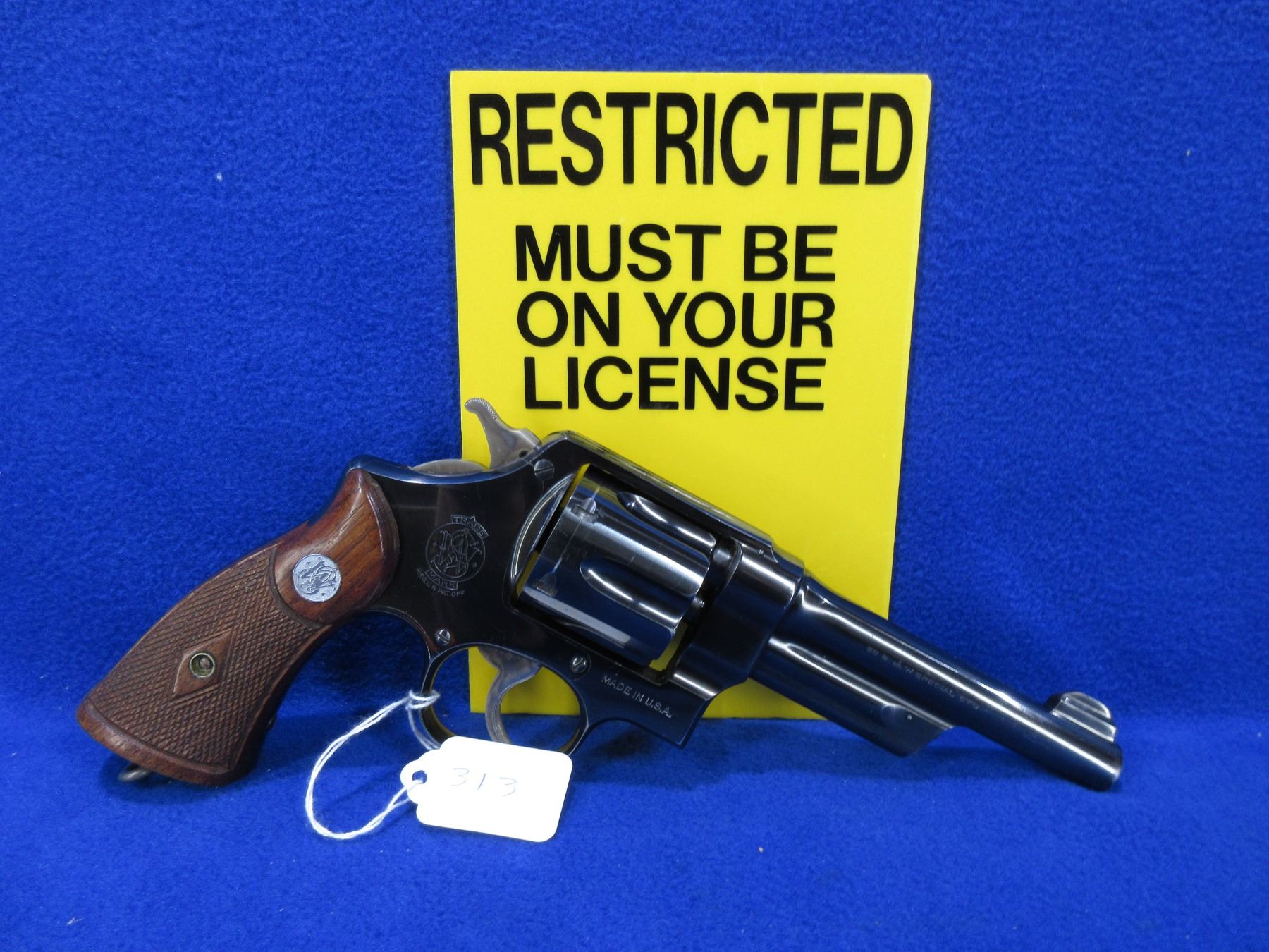 Restricted - Smith & Wesson Heavy Duty in 38-44 Special - This double action 6 shot revolver appears to be in very good working order. Barrel is 127MM, rifling very good, bluing very good, has fixed sights, wood grips are very good. British Columbia Police Rack 41 is stamped on butt by lanyard, Made in 1938-39. Ser # 62202