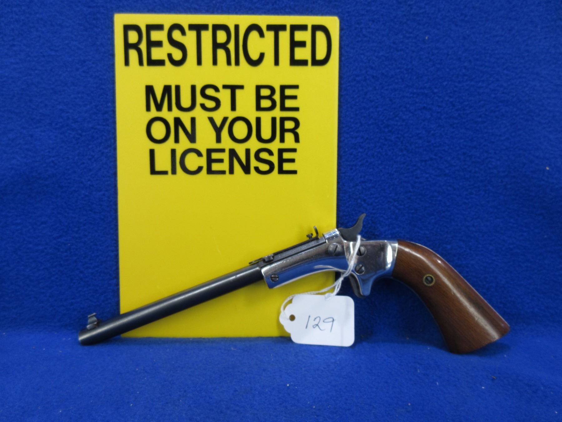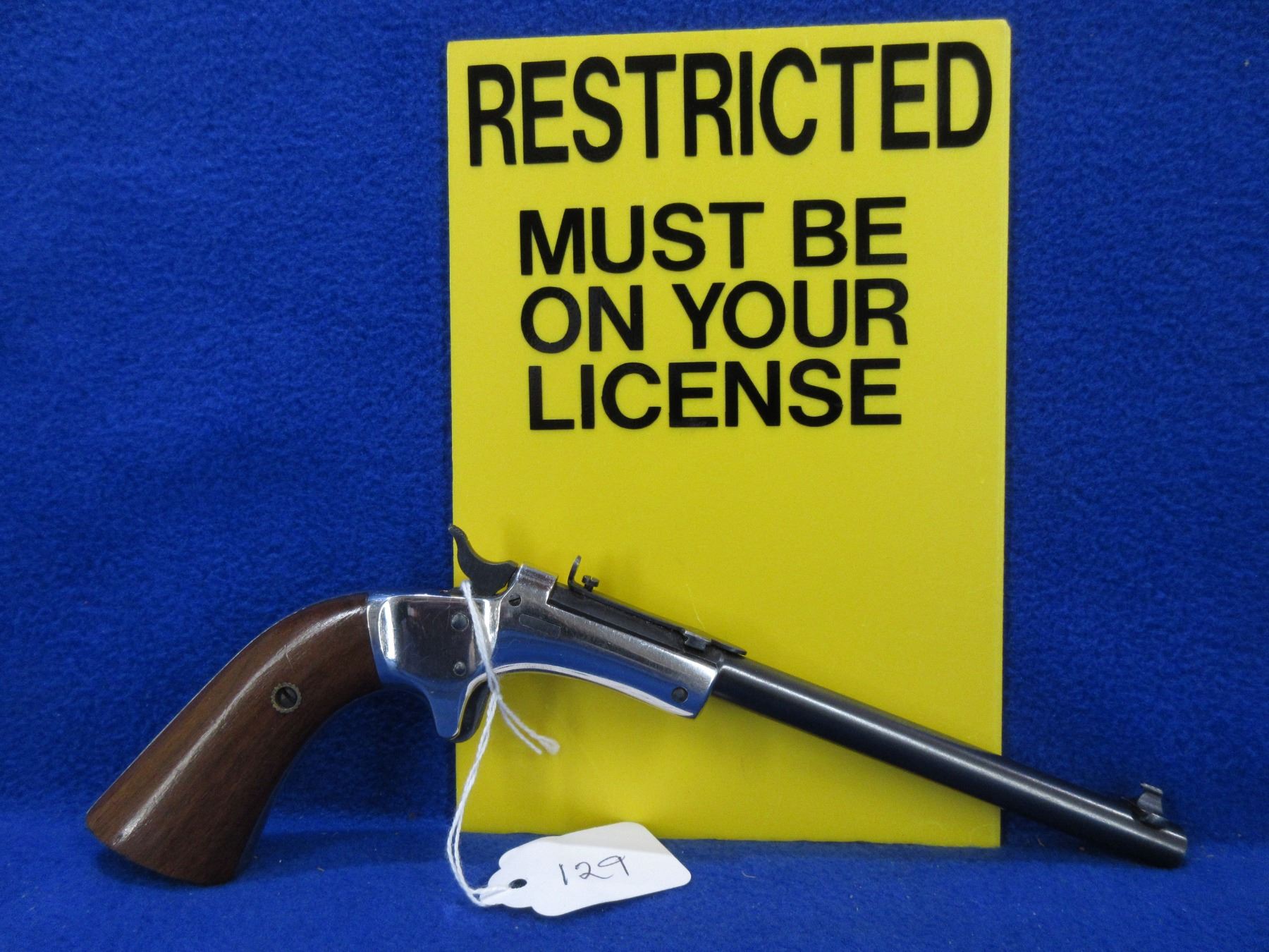 Restricted - Stevens No. 35 Target in 22 LR - This single shot tip up pistol appears to be in very good working order. Barrel is 152MM, rifling good to very good, nickel finish and bluing very good, adjustable front sight, adjustable rear sight, wood grips are good to very good. Ser # 99446